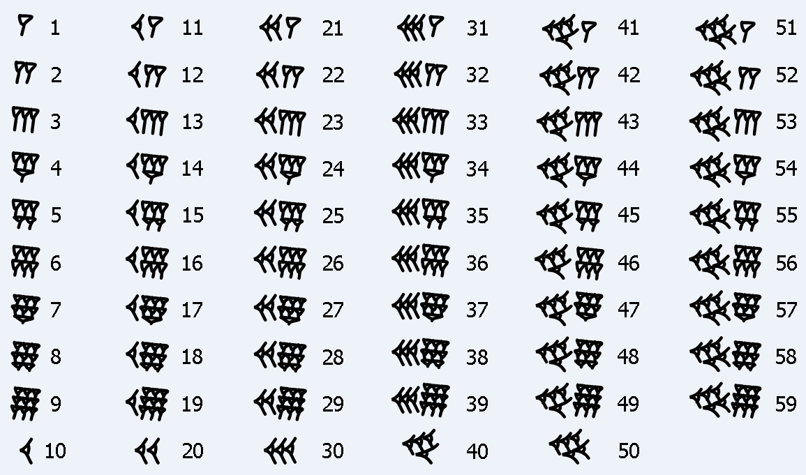В вавилонской системе для нуля не было значка, что приводило к неоднозначной записи чисел. О значении чисел приходилось догадываться по контексту или по отступам между значками. Позднее, между VI и III веком до нашей эры, обозначение нуля появилось в виде символов "\\", но использовалось только в средине шестидесятеричных чисел для обозначения пустых разрядов. В конце числа значки нуля использовались только в астрономических вычислениях. Пример записи чисел от 1 до 59 в вавилонской шестидесятеричной системе: