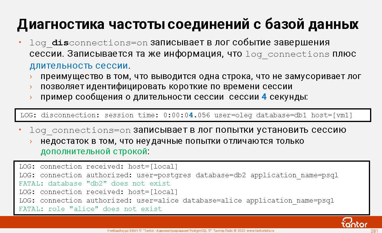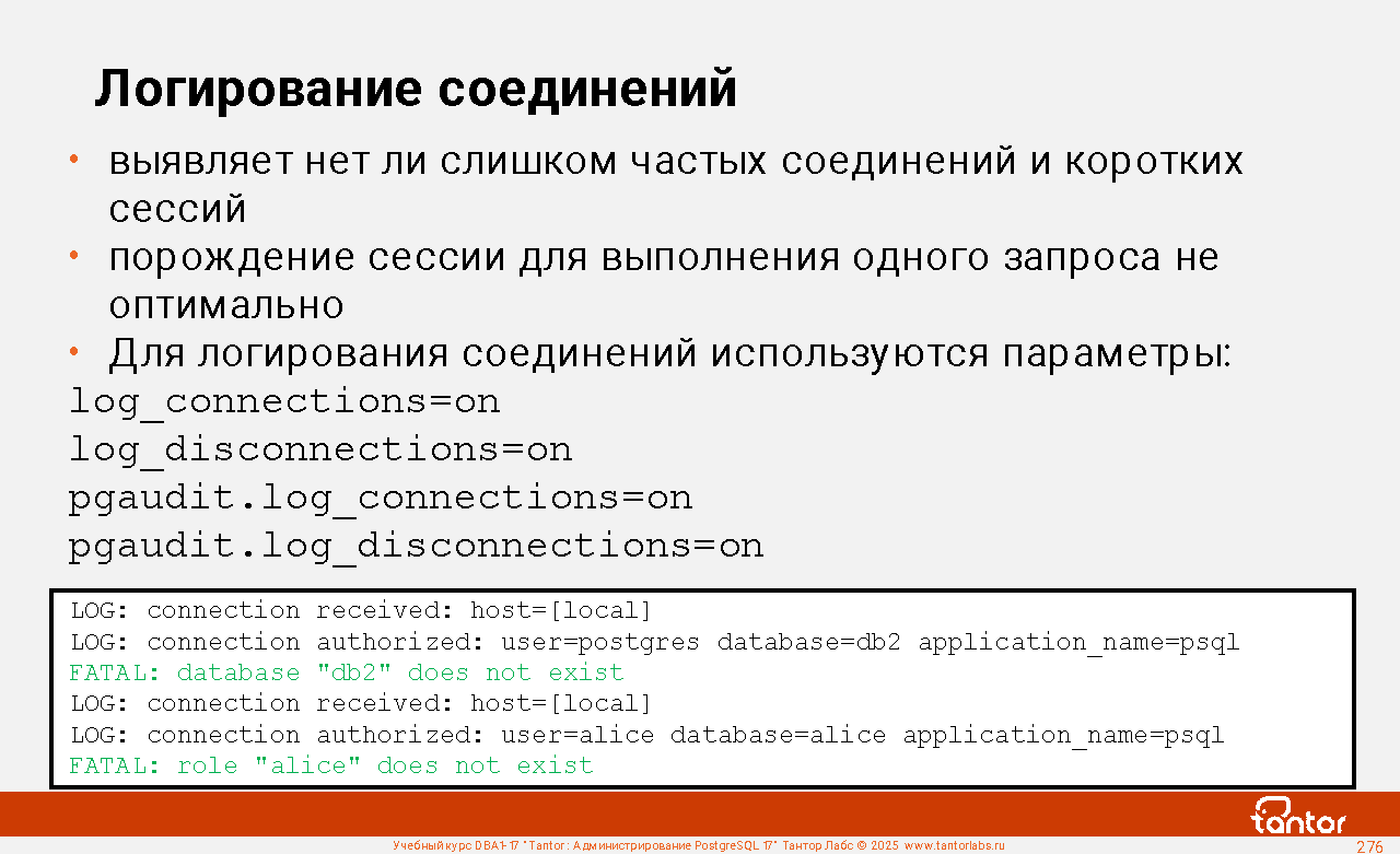 При использовании параметров log_connections и log_disconnections сообщения записываются в журнал кластера. При промышленной эксплуатации, в журнал записывается множество сообщений. Логирование соединений не нужно для повседневного анализа и замусоривает общий журнал, затрудняя чтение более важных сообщений и желательно, чтобы логирование соединений, команд ddl и других команд выполнялось в не в журнал кластера, а в отдельный файл или файлы.