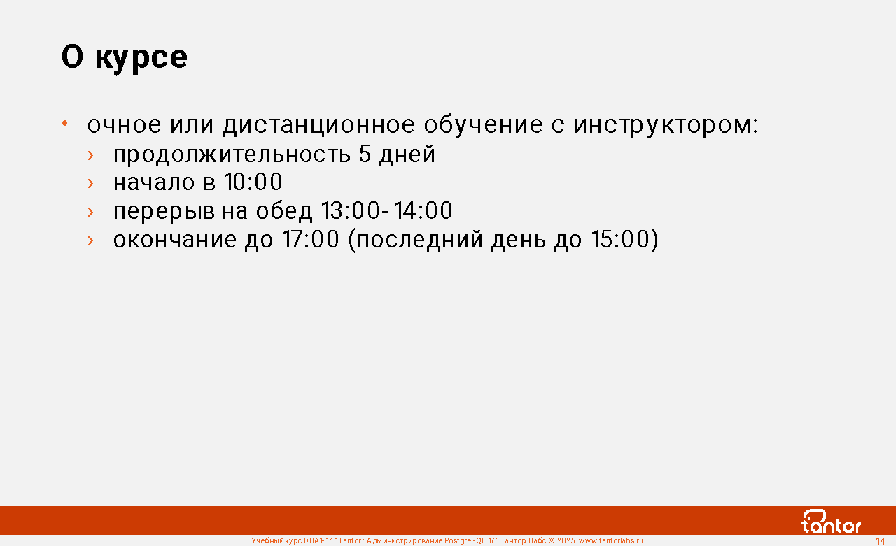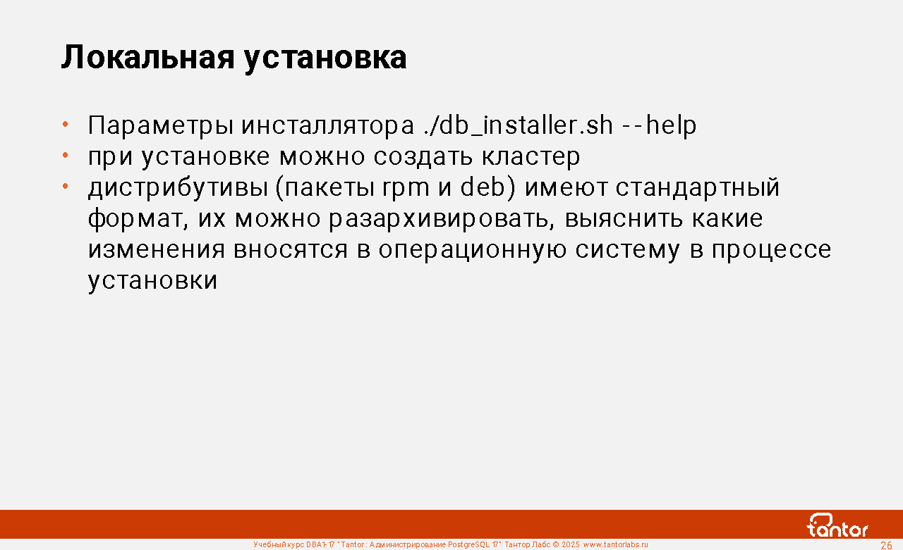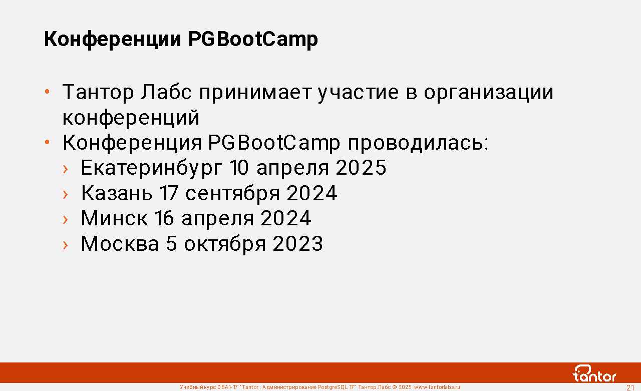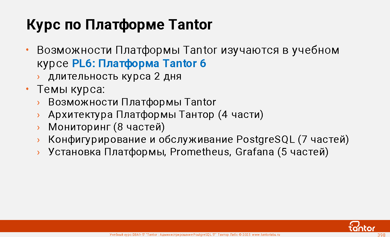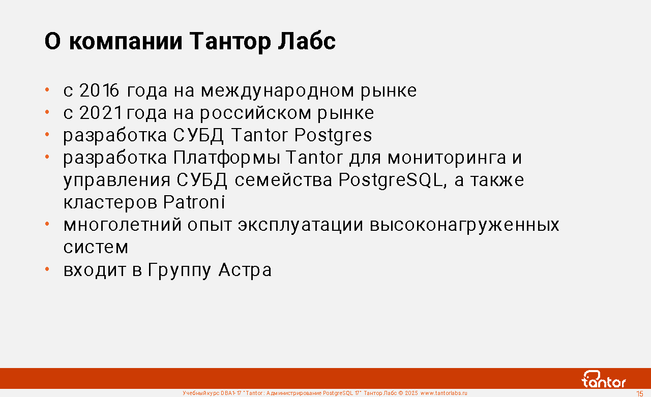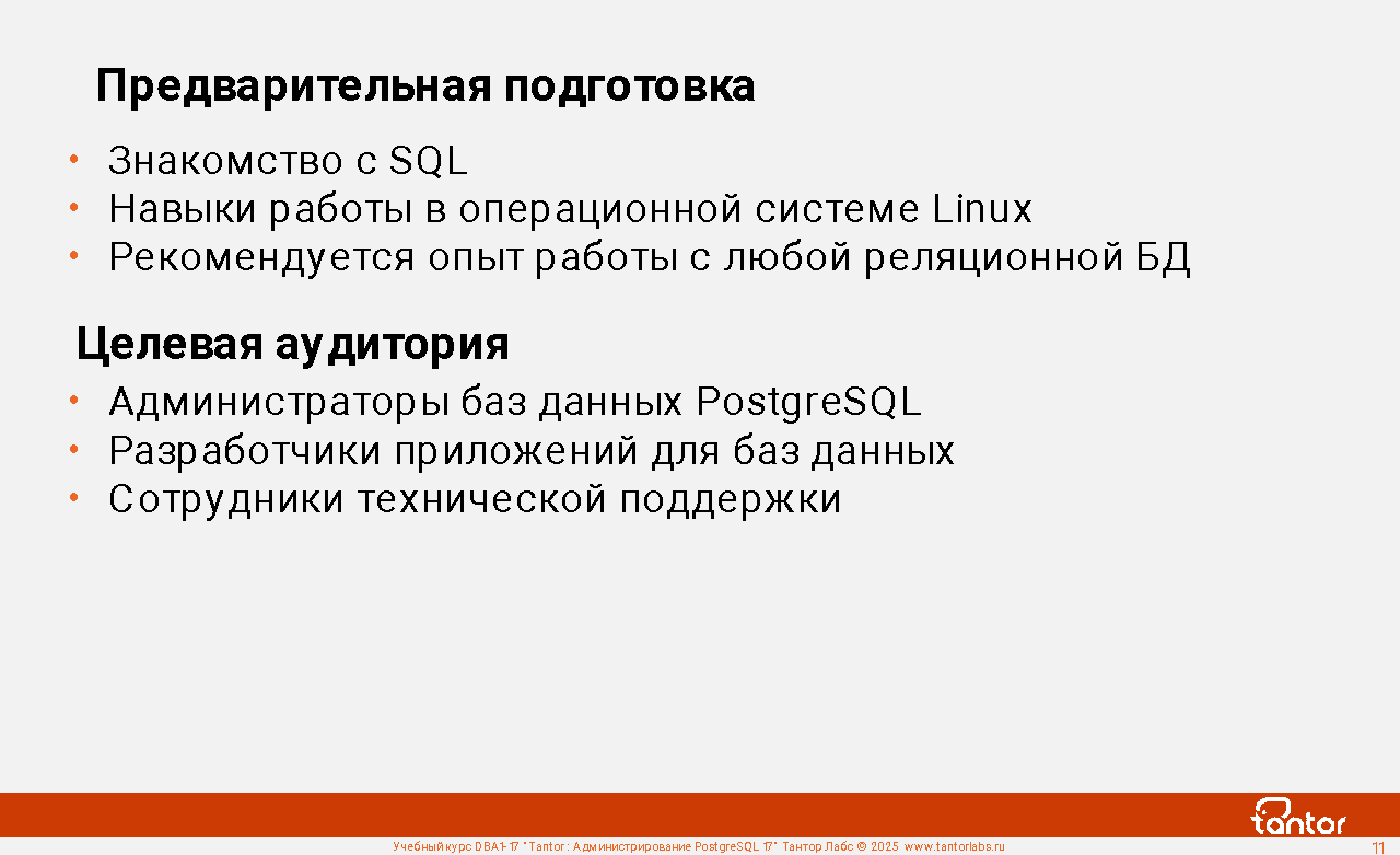 В курсе будут рассмотрены основные задачи администрирования баз данных семейства PostgreSQL на примере СУБД Tantor Postgres и особенности эксплуатации СУБД Tantor Postgres.