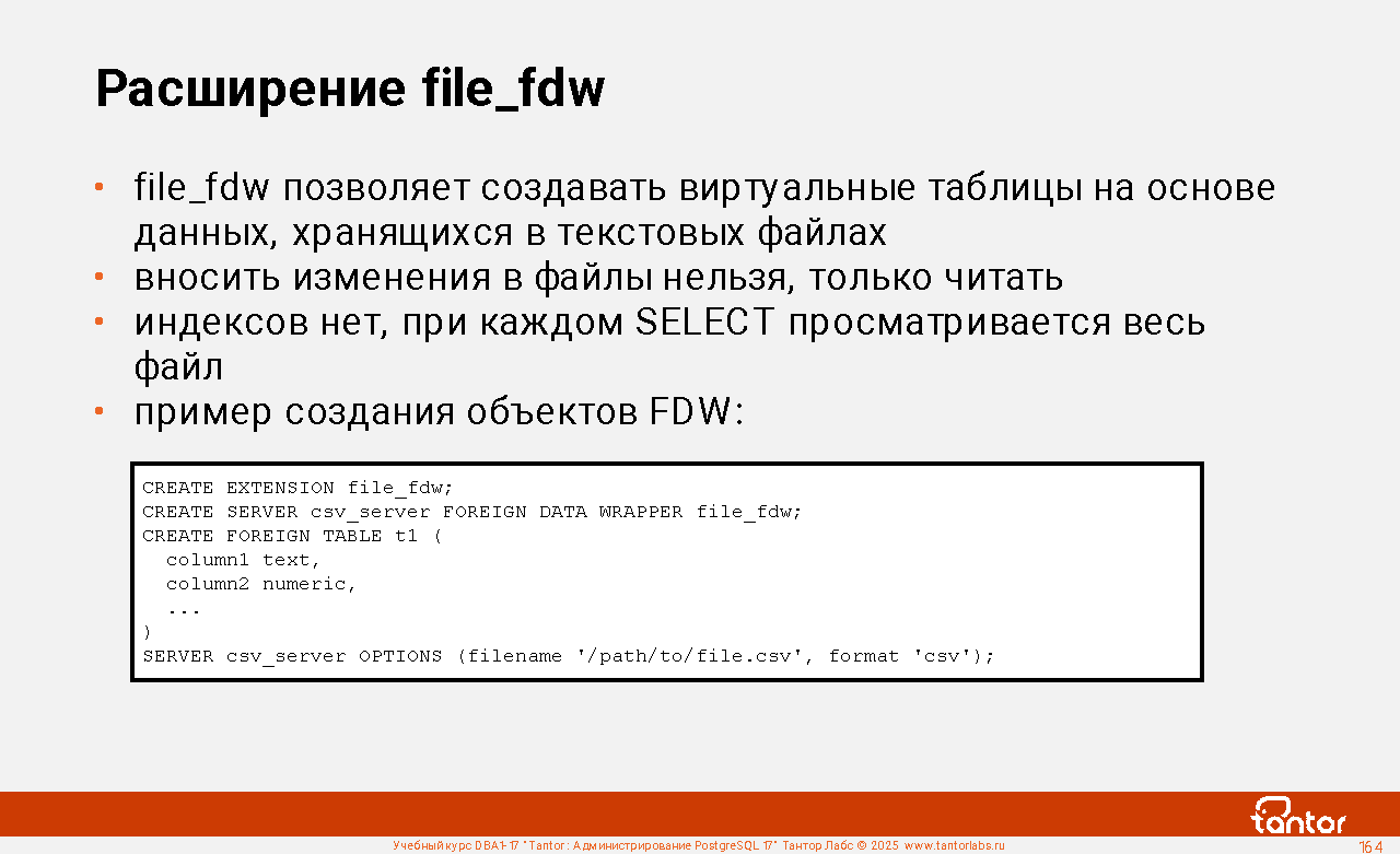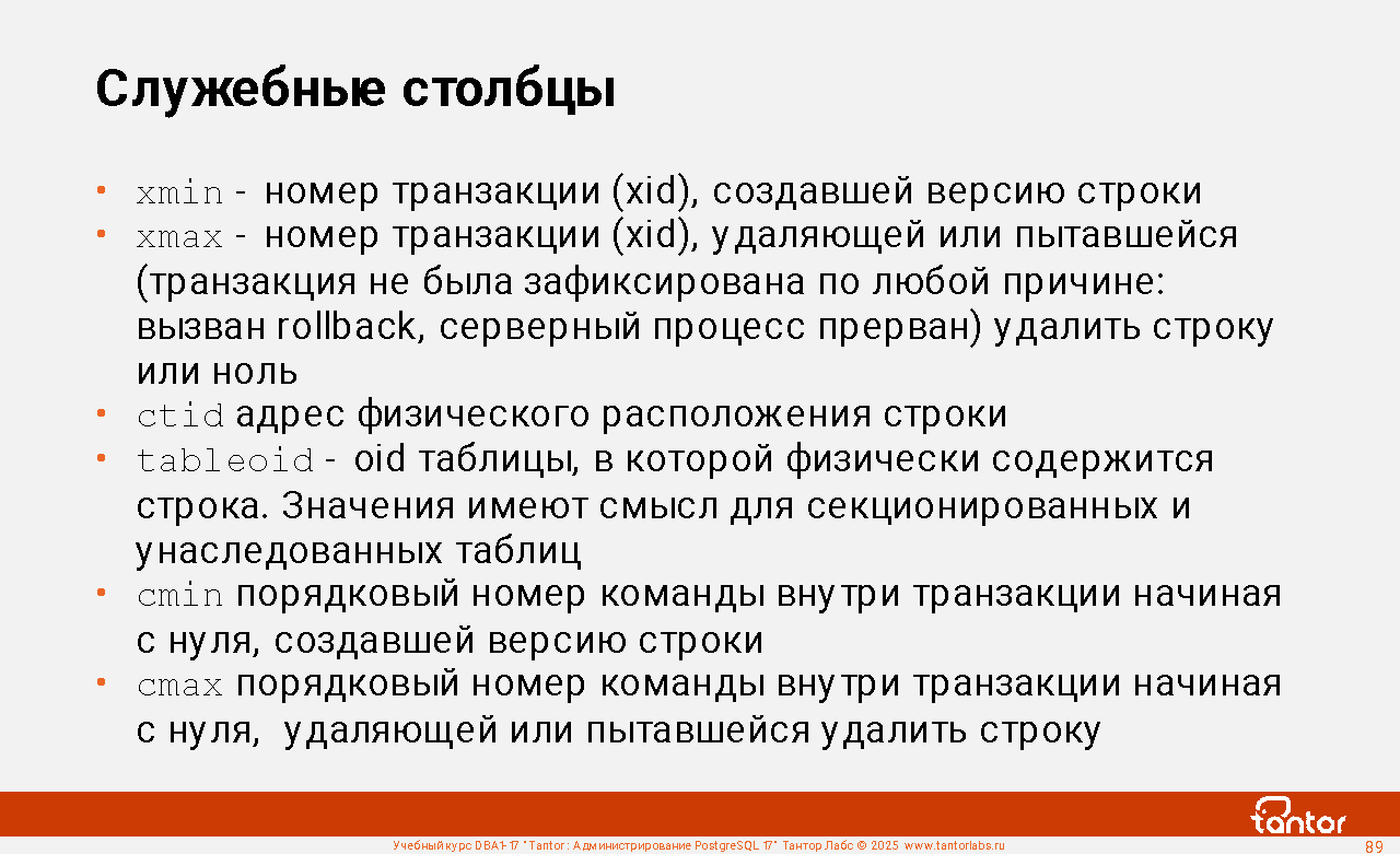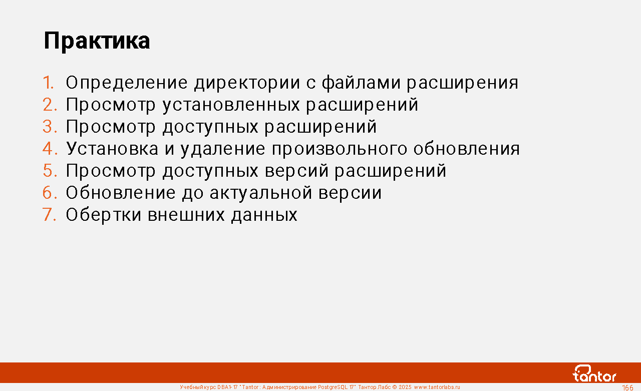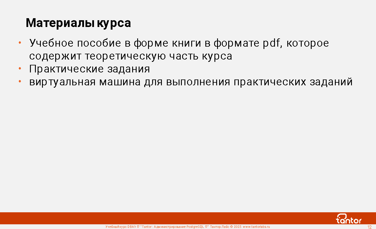 3) Виртуальная машина с установленной операционной системой Astra Linux 1.8 и СУБД Tantor Postgres версии 17.5. Может предоставляться доступ к виртуальной машине на время курса или образ в формате ova. Образ виртуальной машины можно использовать с Oracle VirtualBox версии 6.1 и выше.