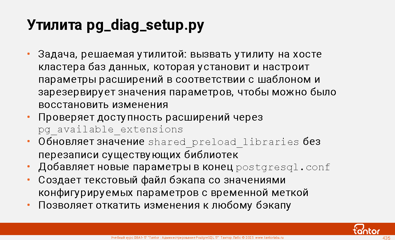 Представляет собой скрипт, написанный на языке python. Задача, решаемая утилитой: вызвать утилиту на хосте кластера баз данных, которая установит и настроит параметры расширений, в соответствии с шаблоном, и зарезервирует значения параметров, чтобы можно было восстановить изменения. Предполагается, что будут настраиваться параметры диагностических расширений типа pg_store_plans, pg_stat_statements, pg_stat_kcache, auto_explain, pg_buffercache, pg_trace, pg_wait_sampling.