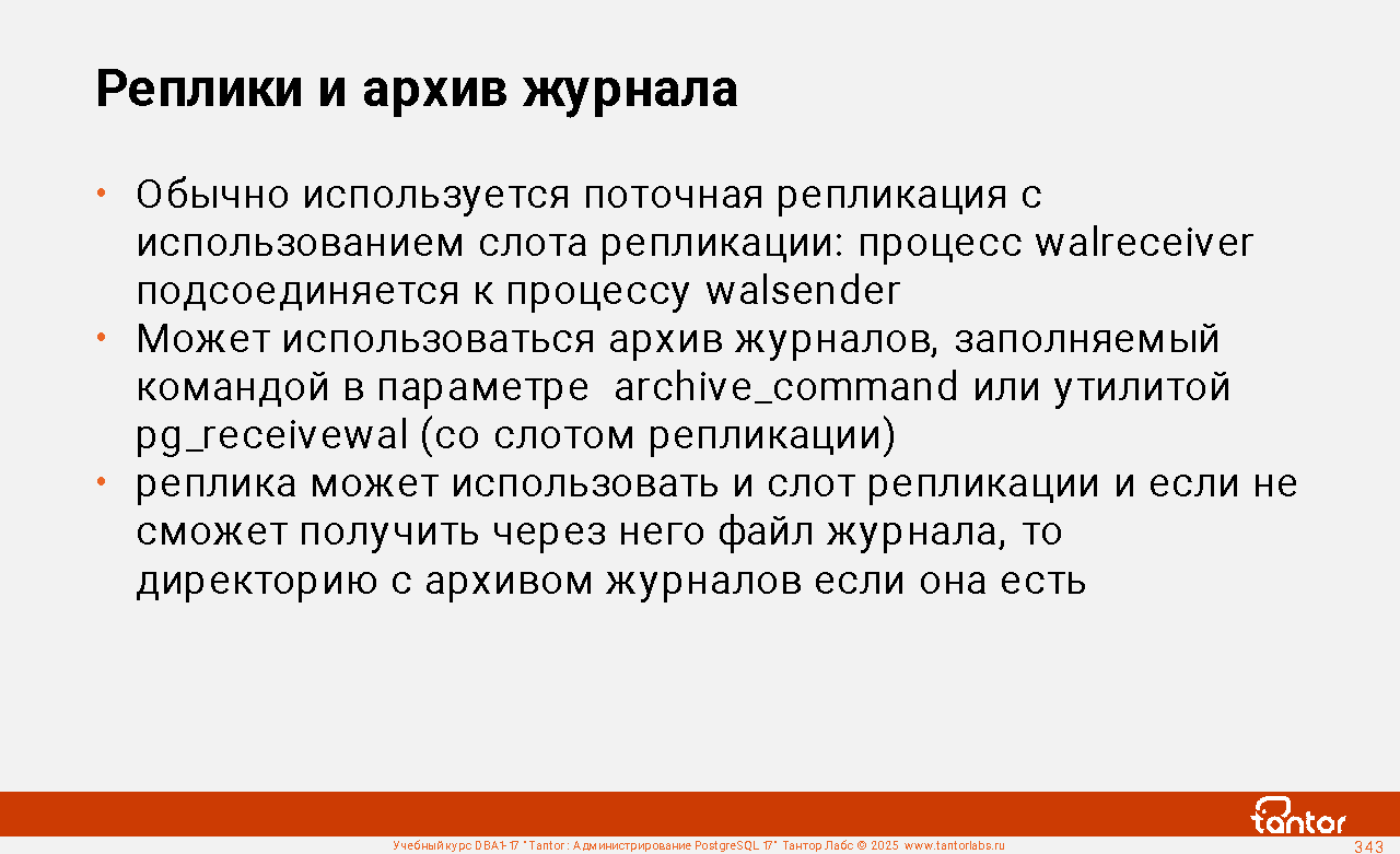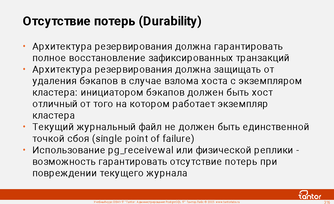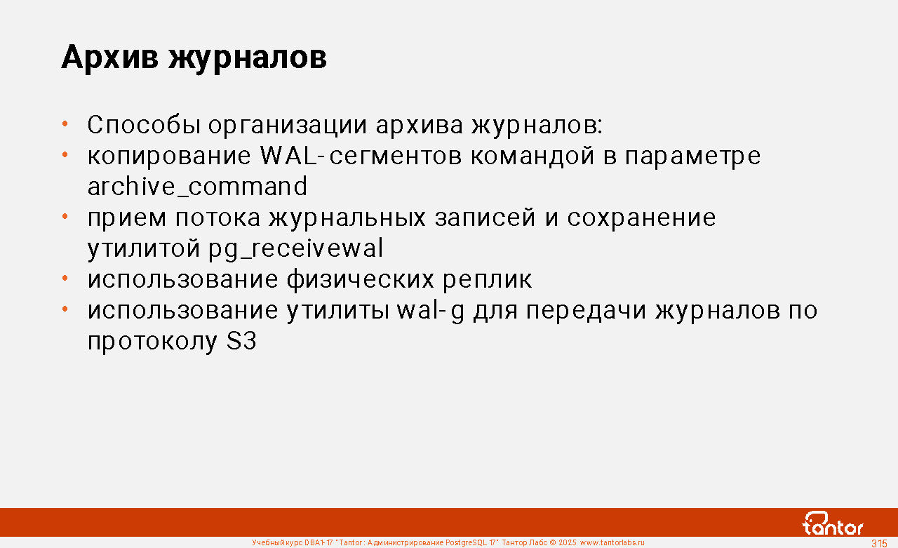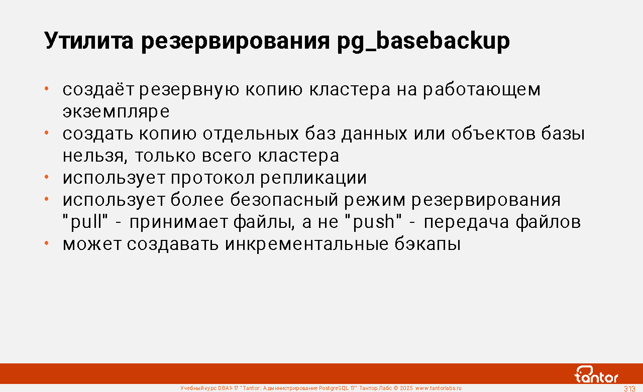 1) создавать резервные копии кластера и WAL-сегментов в режиме "push". Текущий WAL-сегмент не резервируется и утилита не может использоваться как единственное решение по обеспечению высокой доступности.