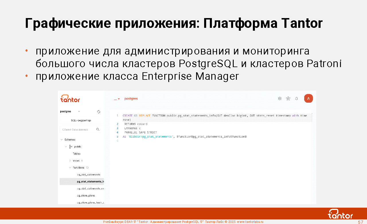 Платформа Tantor - программное обеспечение для управления СУБД Tantor Postgres, форками PostgreSQL, кластерами Patroni. Позволяет удобно управлять большим количеством СУБД. Относится к классу программных продуктов, в который входит Oracle Enterprise Manager Cloud Control.