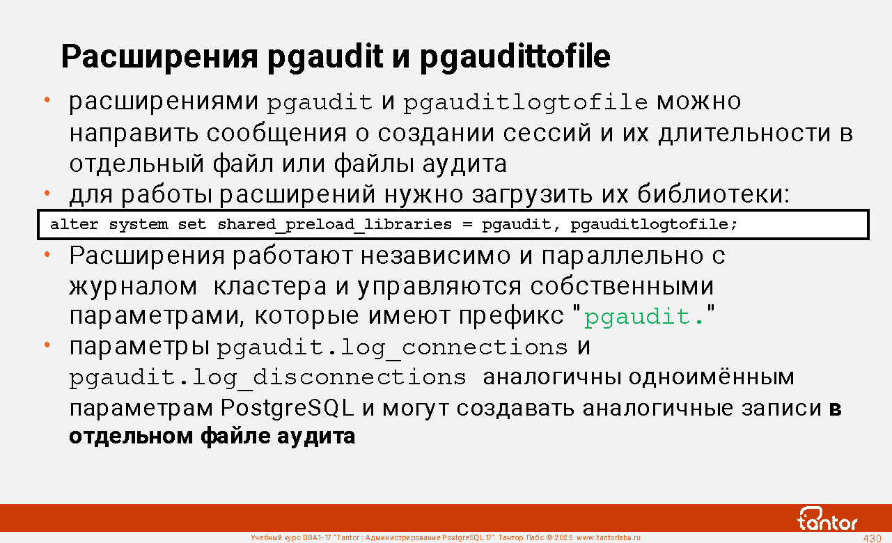 У расширения 18 параметров. 7 параметров относятся к библиотеке pgauditlogtofile, в том числе параметры pgaudit.log_connections и pgaudit.log_disconnections. Эти параметры аналогичны одноимённым параметрам PostgreSQL и могут создавать аналогичные записи, но только в отдельном файле аудита, а не в журнале кластера, в чём большое преимущество этих параметров. Преимущество перевешивает недостатки в виде необходимости загрузки двух библиотек и неудобств их использования. Параметры библиотеки устанавливаются только на уровне кластера, указание этих параметров в переменной окружения приводит к ошибке и невозможности соединиться, в отличие от стандартных параметров: export PGOPTIONS="-c pgaudit.log_connections=off"