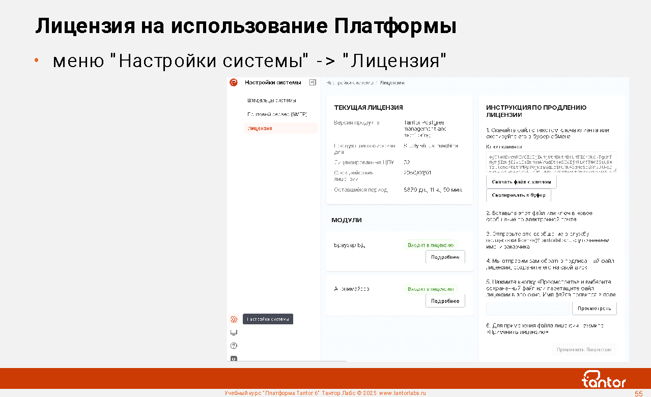 При приобретении СУБД Tantor Postgres бесплатно предоставляется лицензия на Платформу Tantor для управления приобретенными СУБД Tantor Postgres.