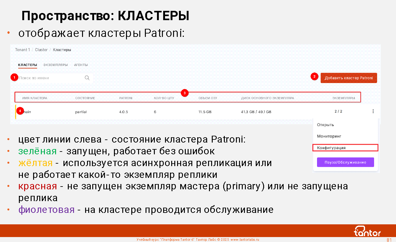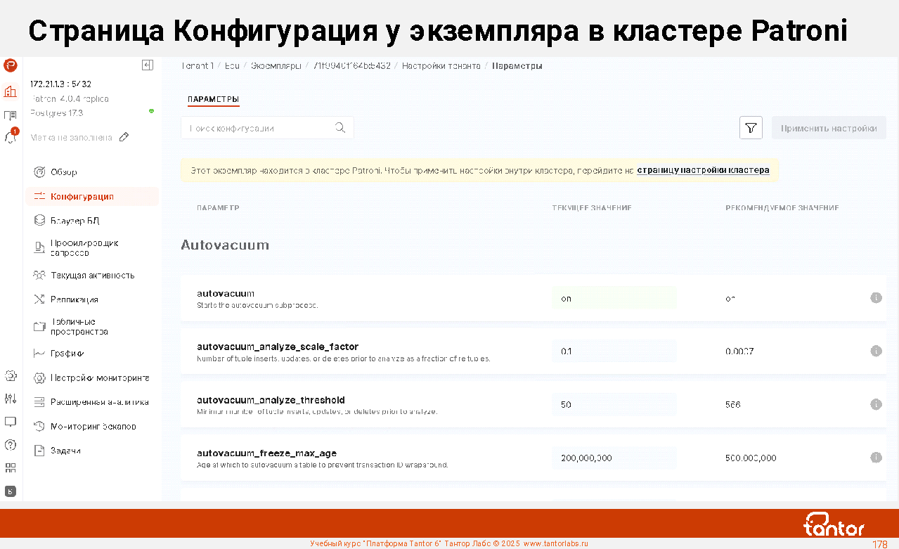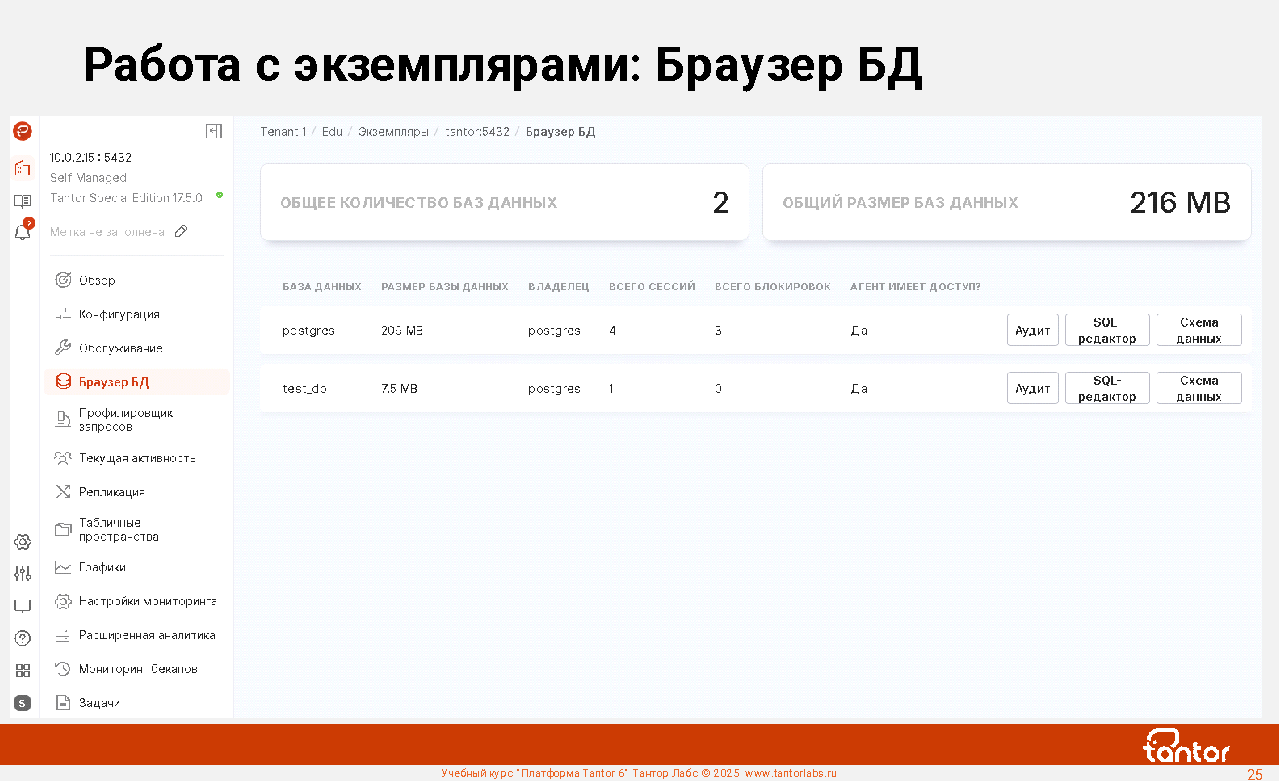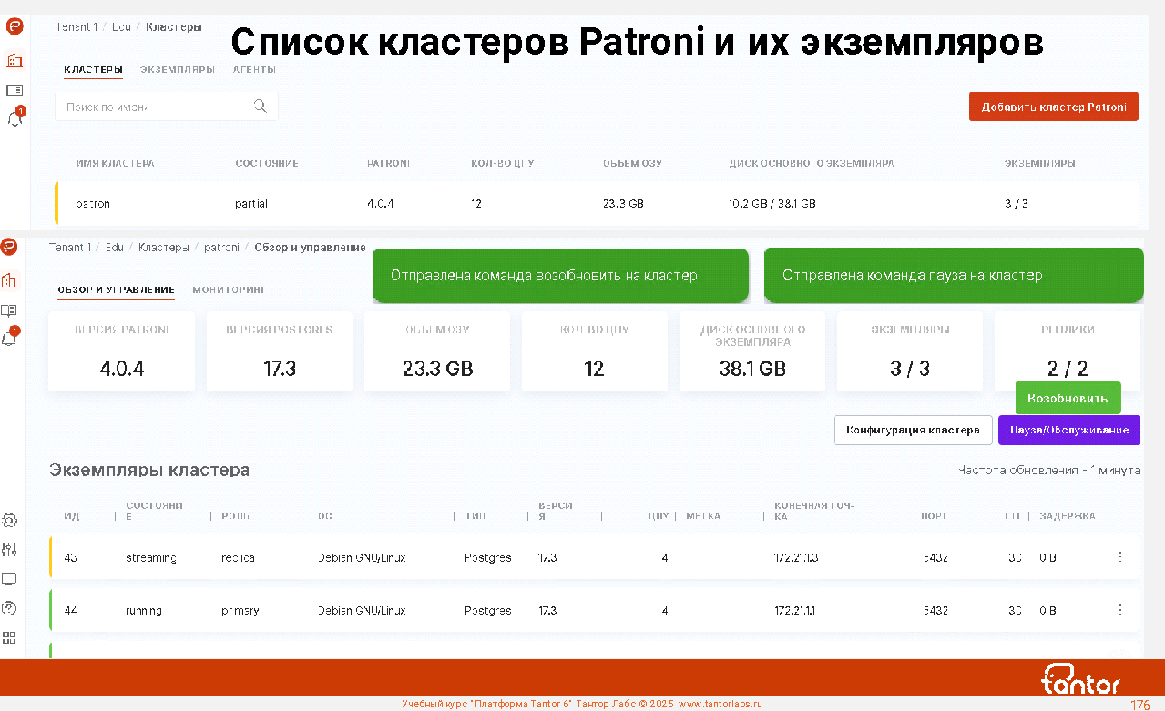 Платформа Tantor - программное обеспечение для управления и мониторинга СУБД Tantor Postgres, любых форков PostgreSQL, кластеров Patroni. Позволяет удобно управлять большим числом экземпляров PostgreSQL.