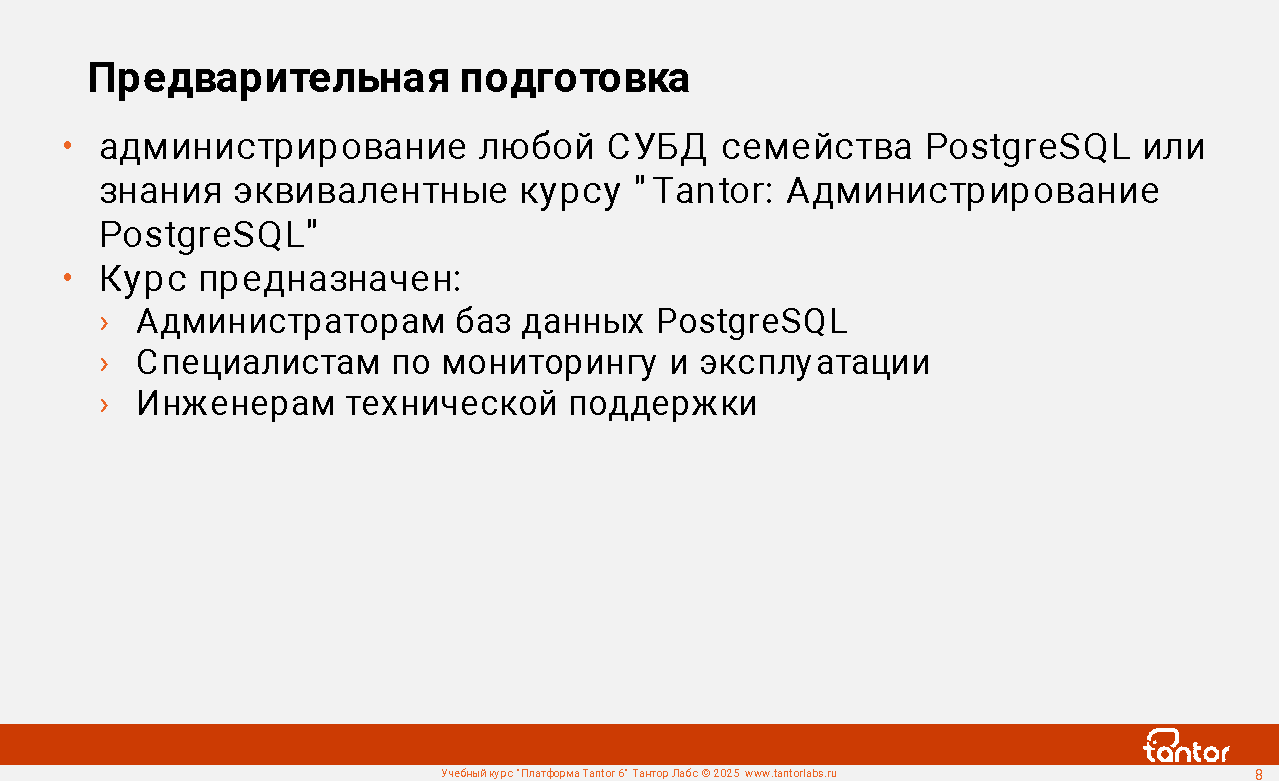 Для успешного прохождения курса достаточно опыта администрирования любой СУБД семейства PostgreSQL или знаний в объеме курса "Tantor: Администрирование PostgreSQL".