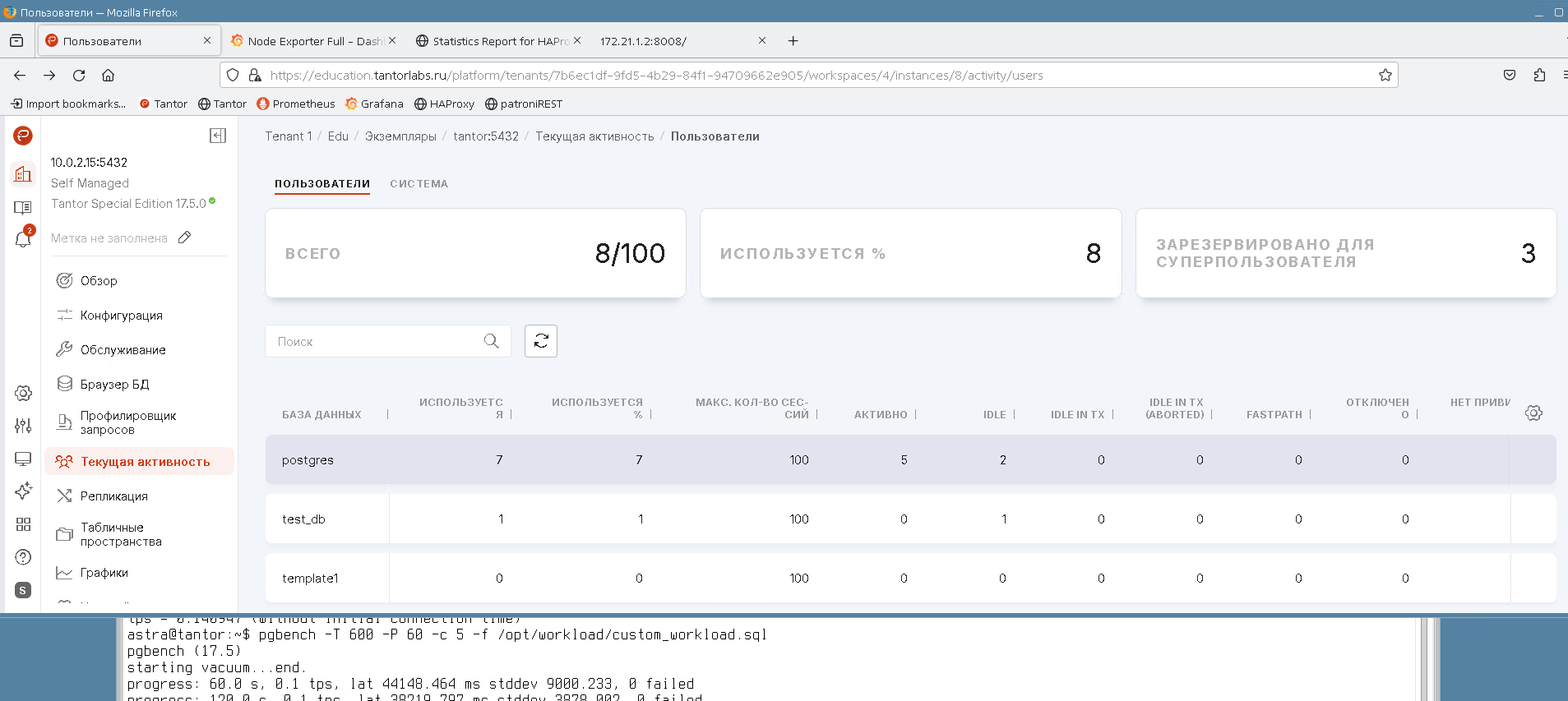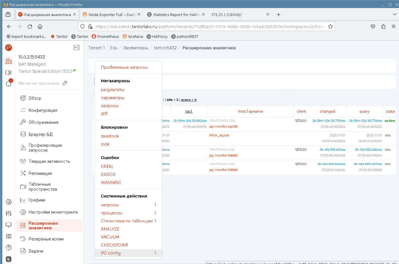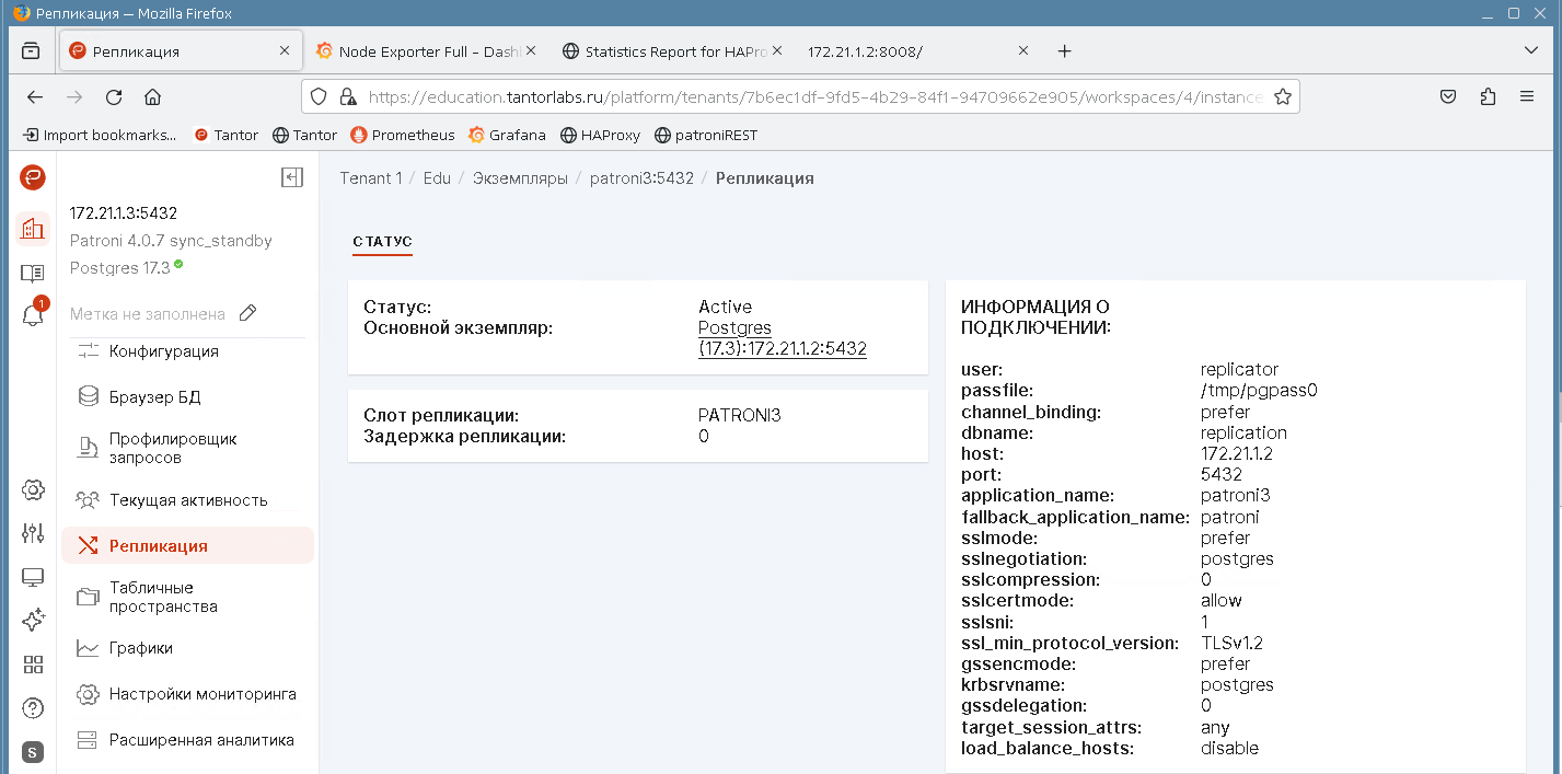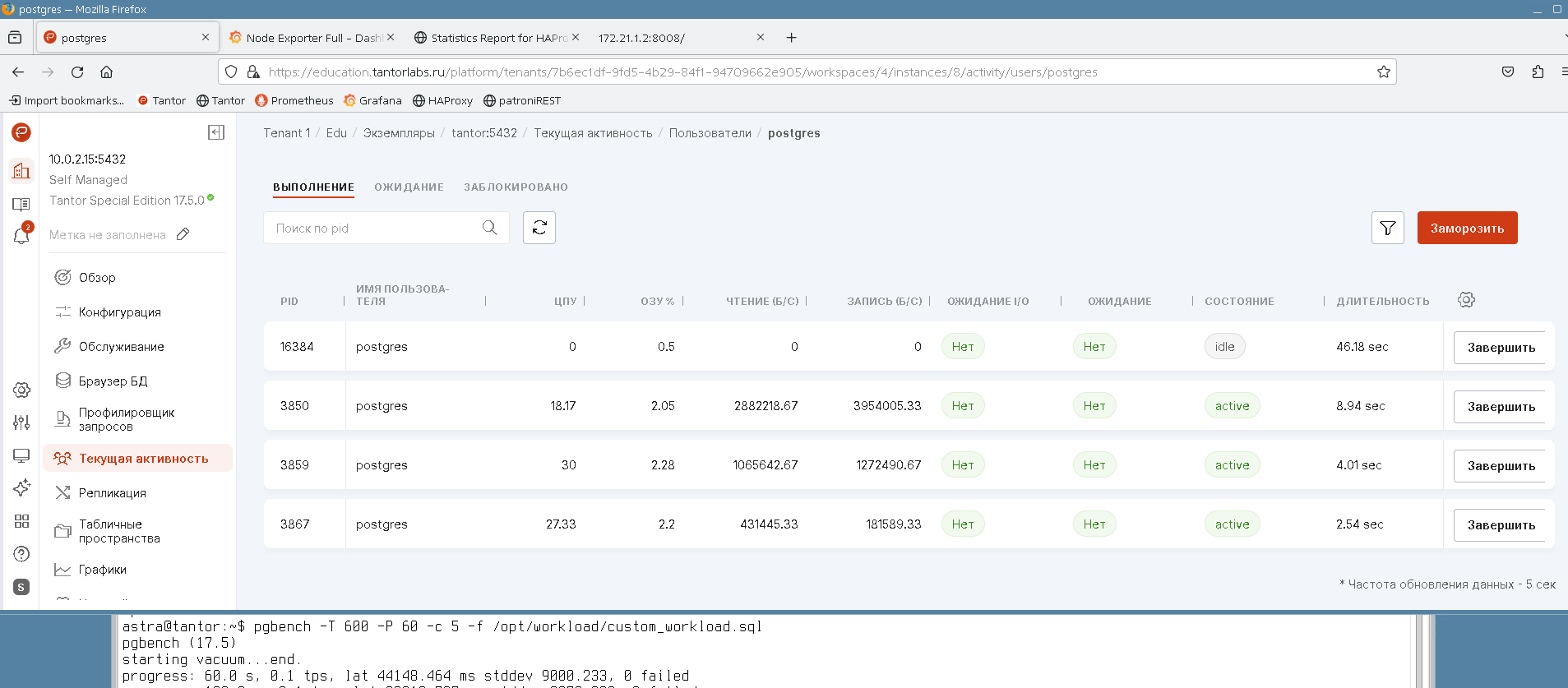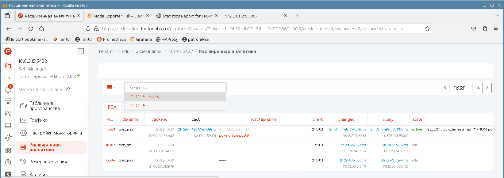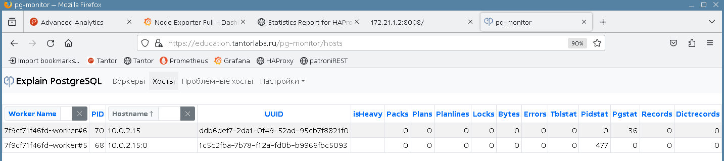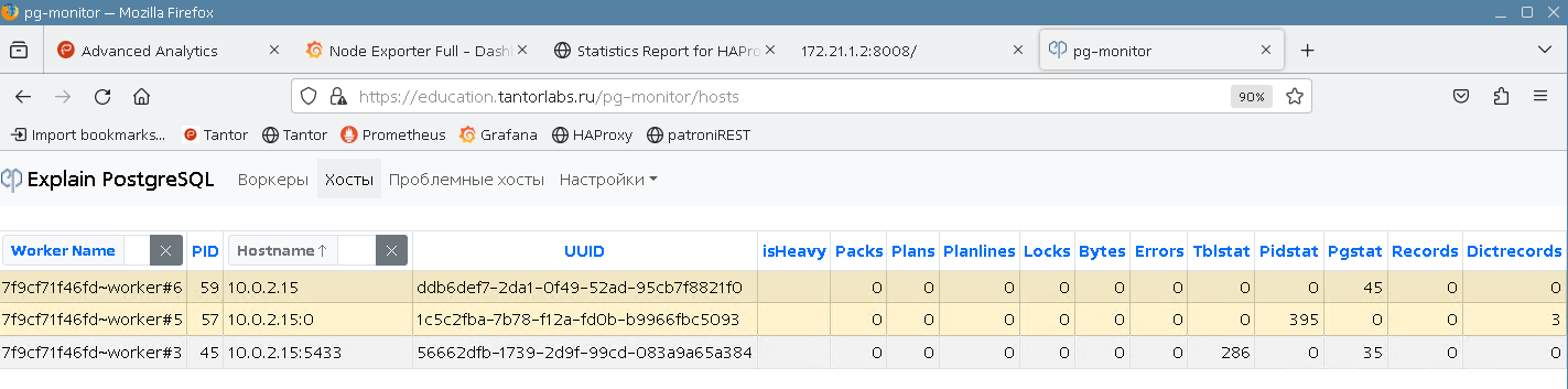 Для проверки того, что рабочие процессы подсоединяются, можно открыть страницу в браузере: https://education.tantorlabs.ru/pg-monitor/hosts