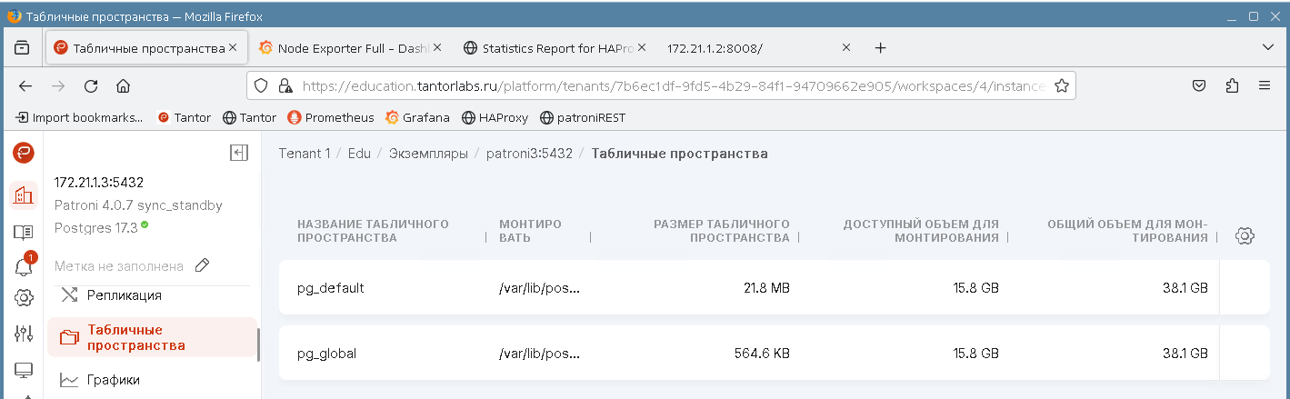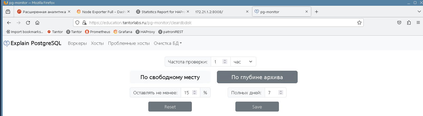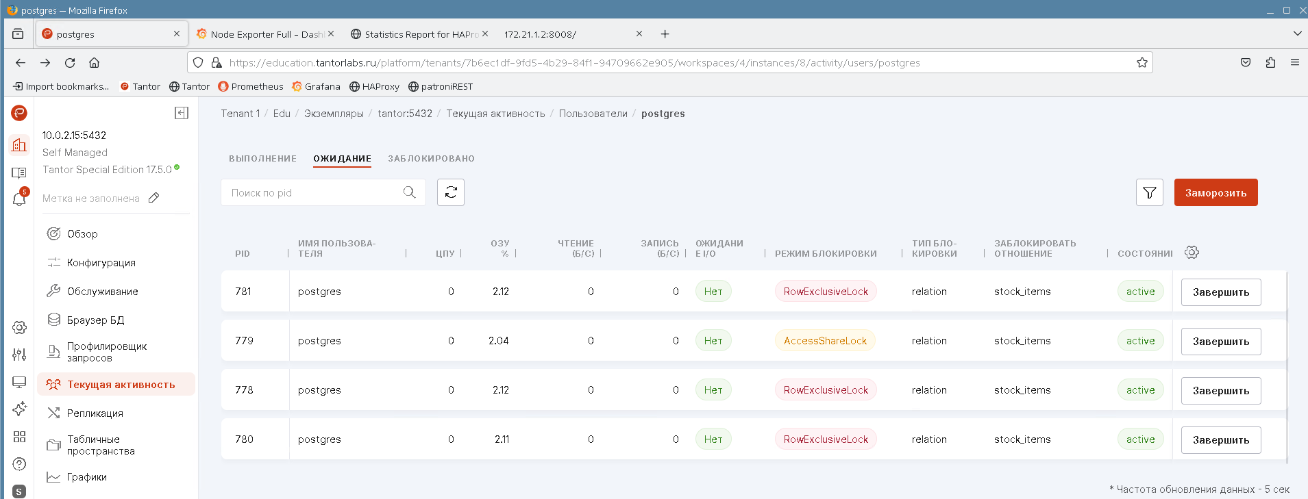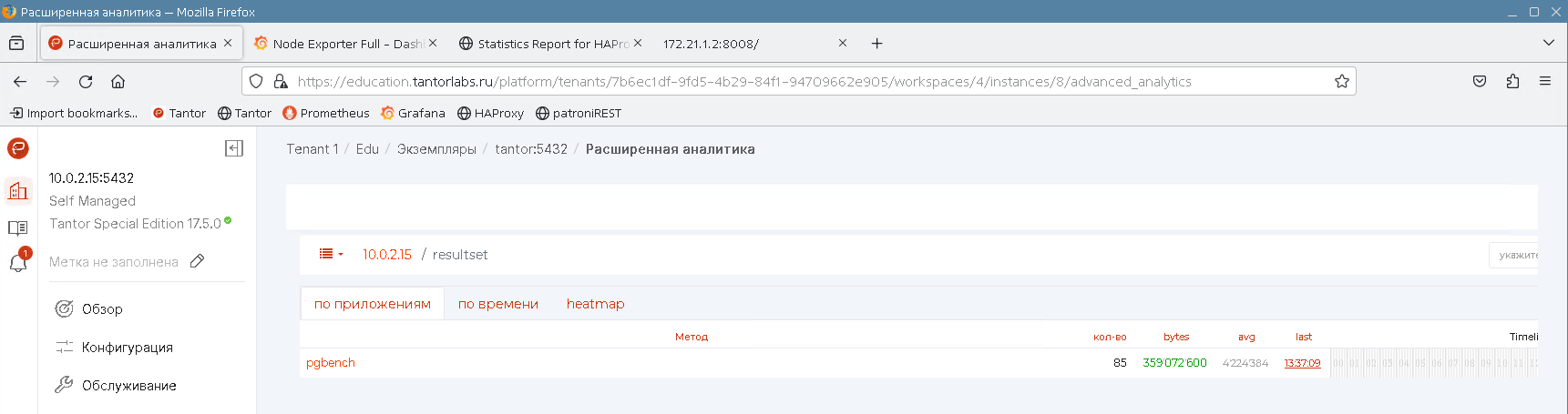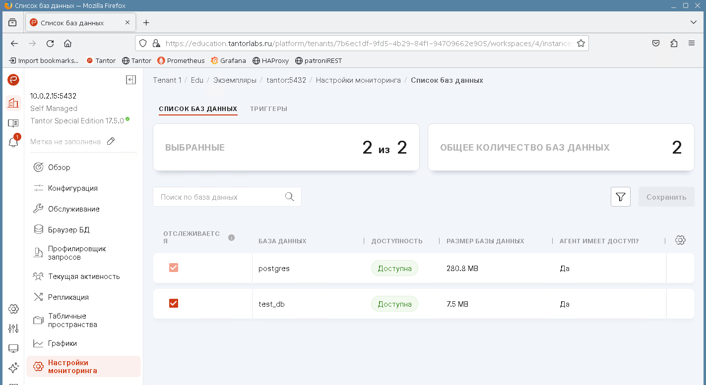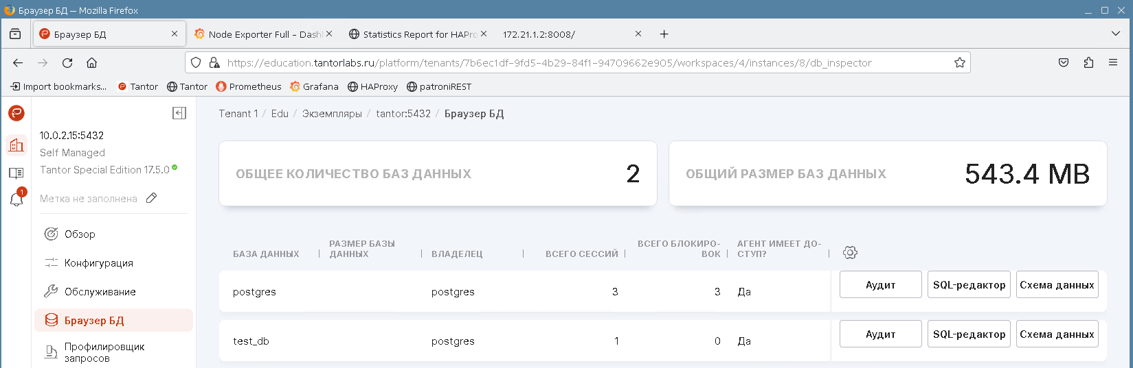 Для проверки того, что рабочие процессы подсоединяются, можно открыть страницу в браузере: https://education.tantorlabs.ru/pg-monitor/hosts