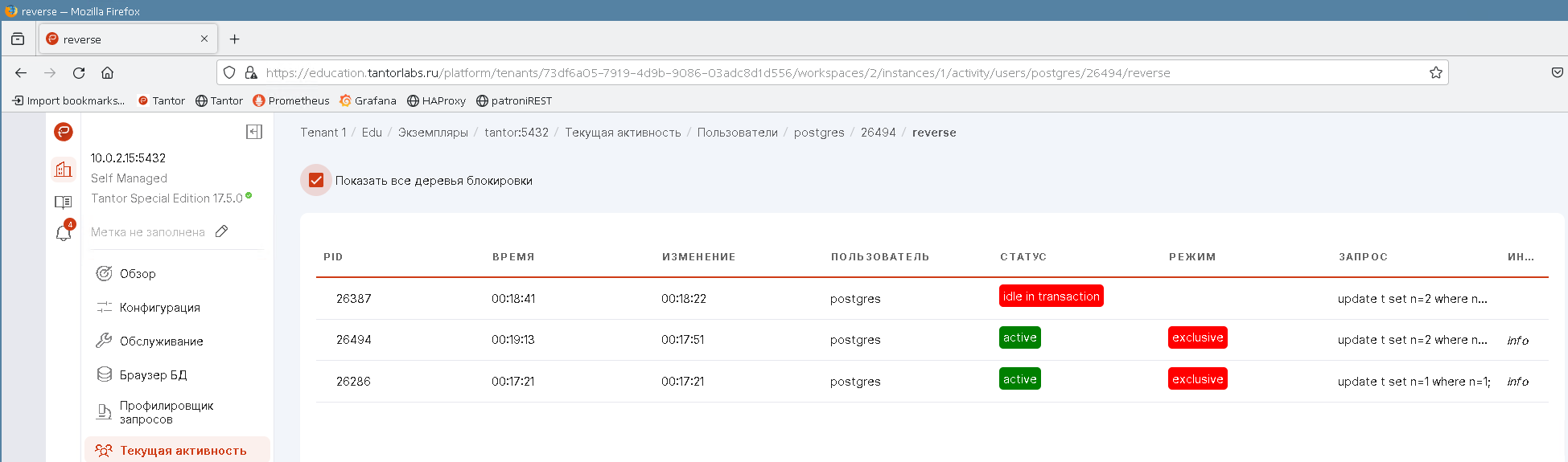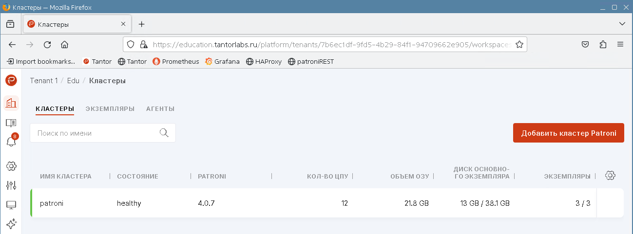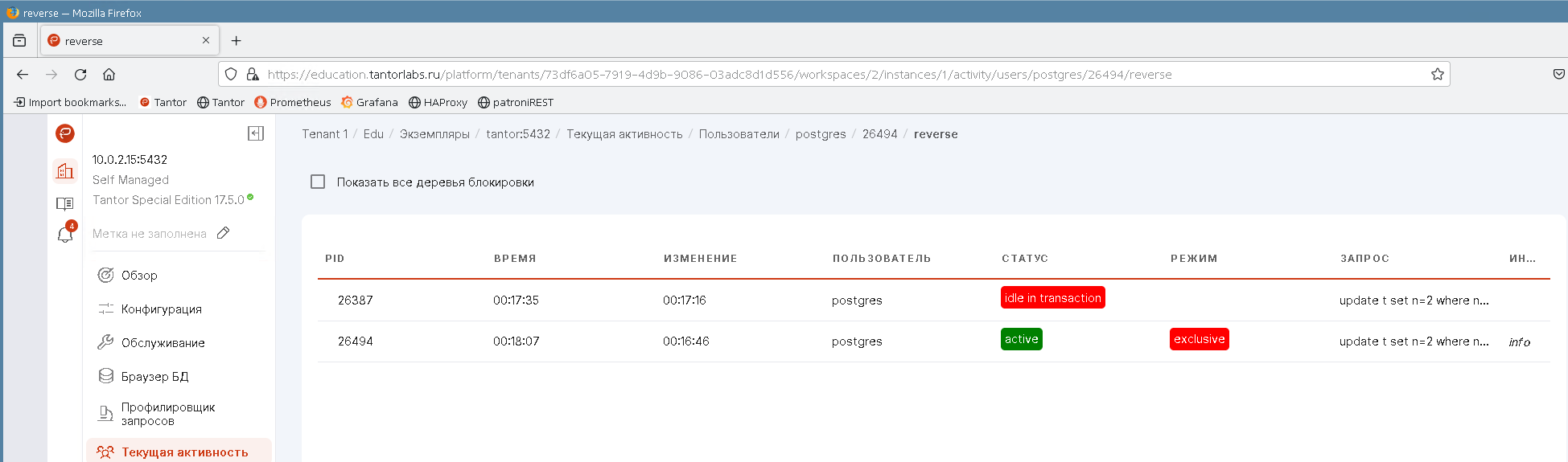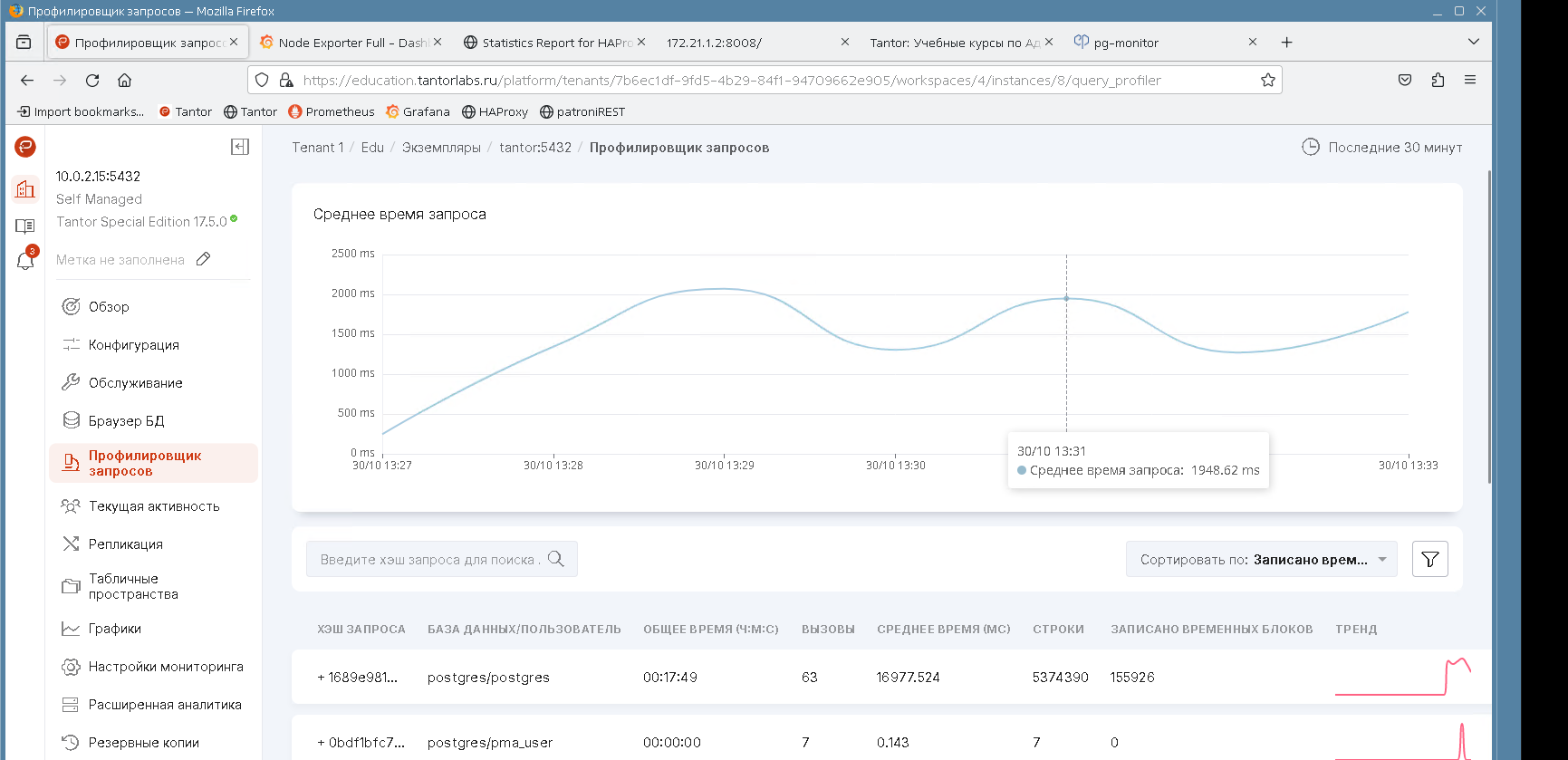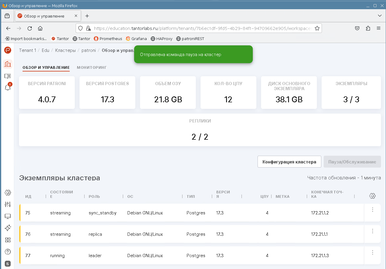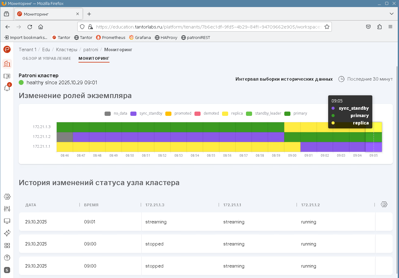 Для проверки того, что рабочие процессы подсоединяются, можно открыть страницу в браузере: https://education.tantorlabs.ru/pg-monitor/hosts