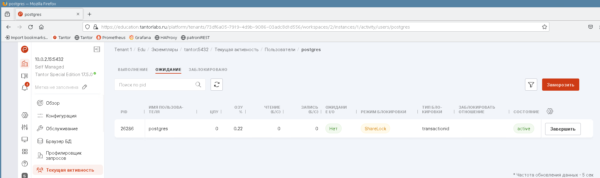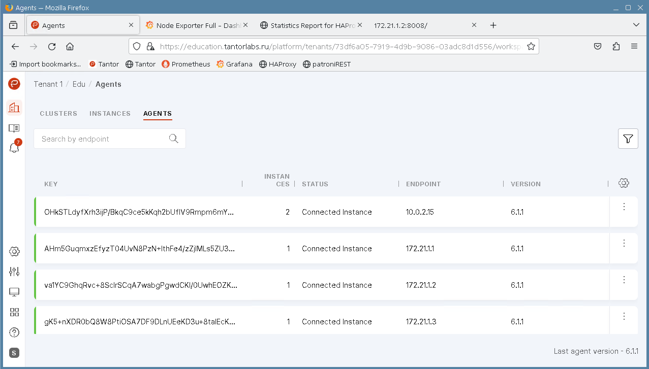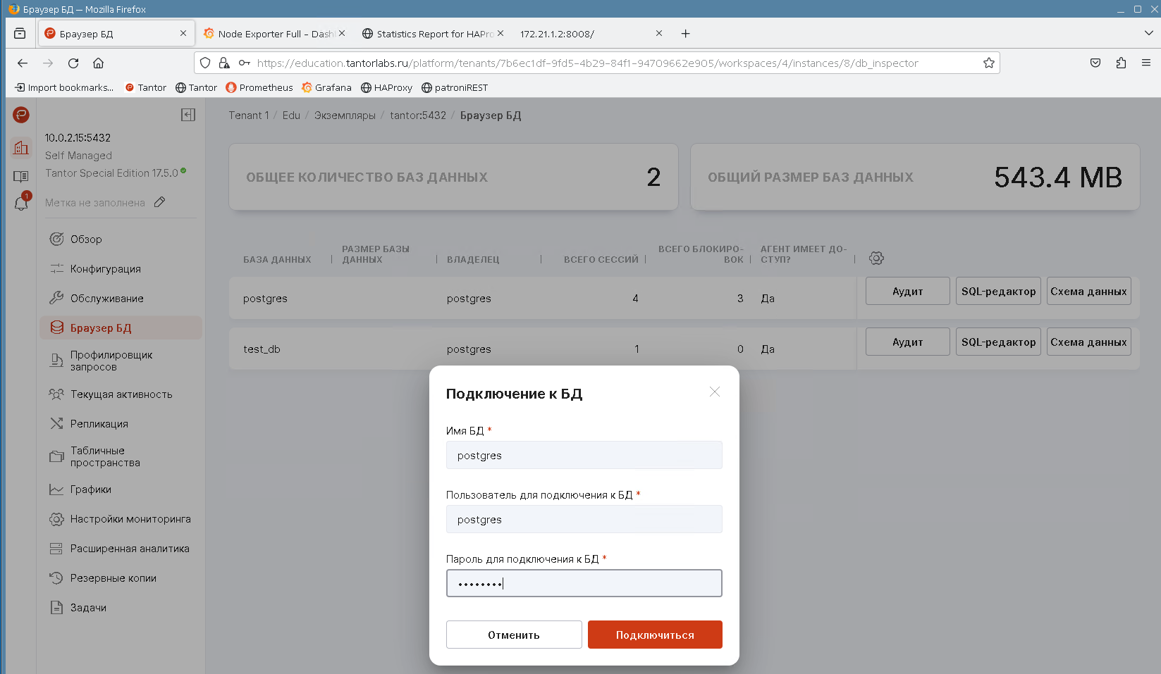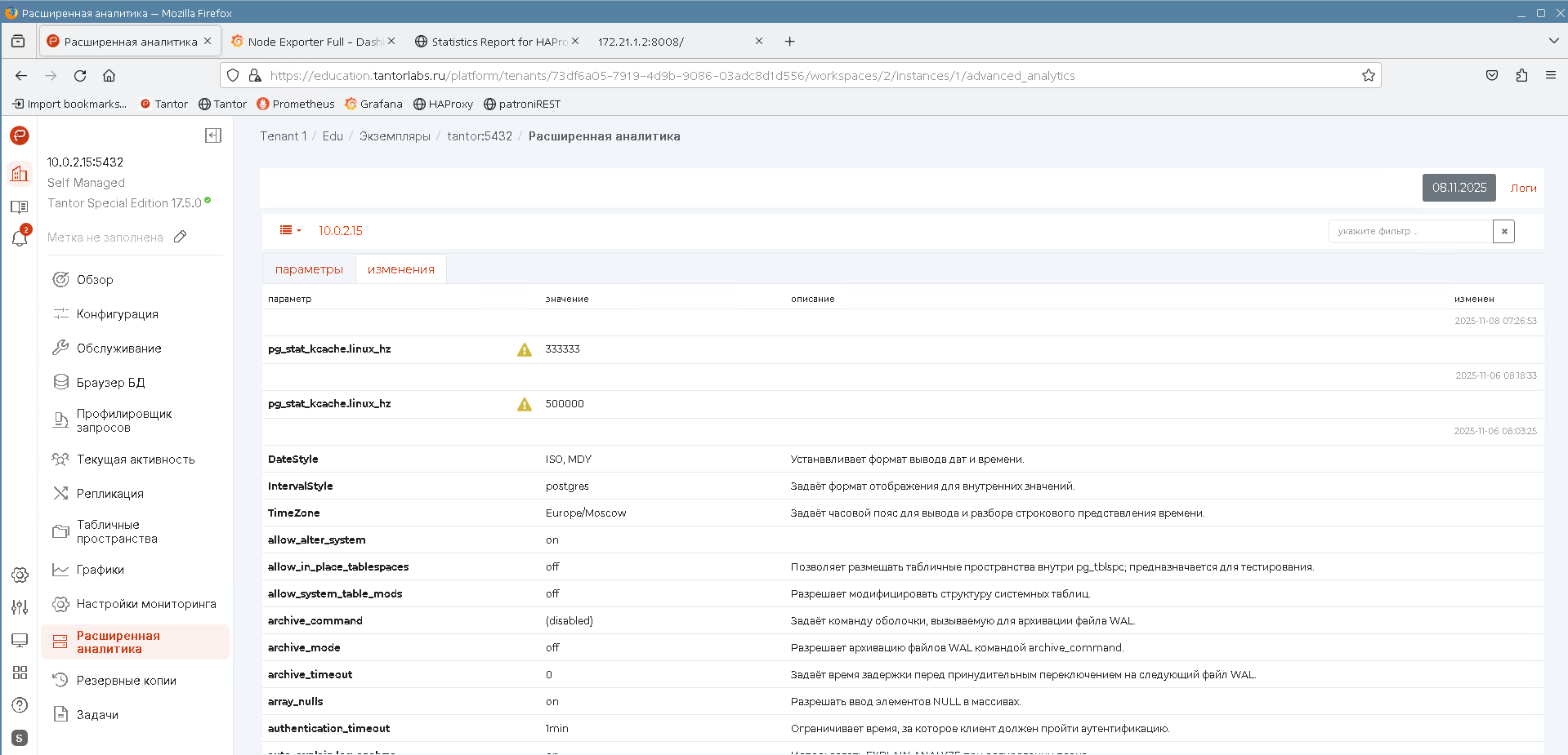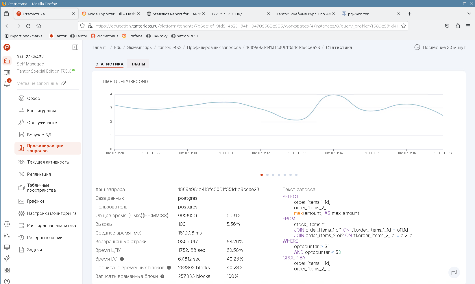 Для проверки того, что рабочие процессы подсоединяются, можно открыть страницу в браузере: https://education.tantorlabs.ru/pg-monitor/hosts