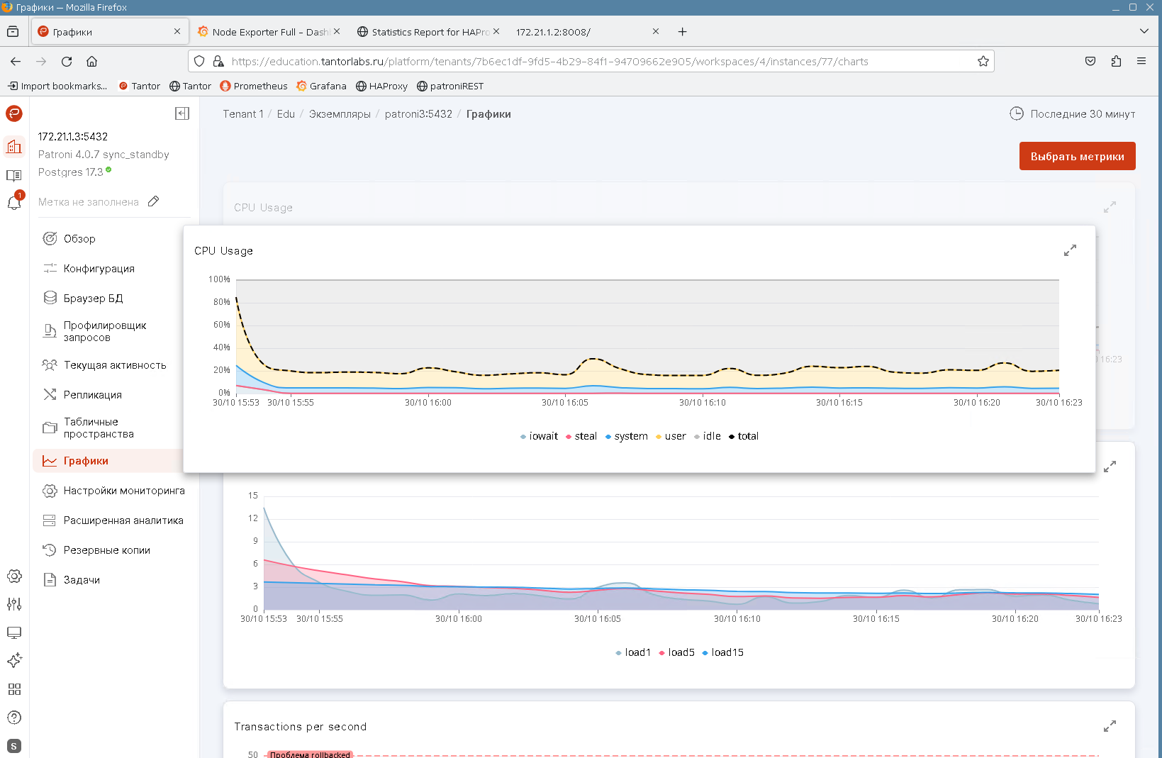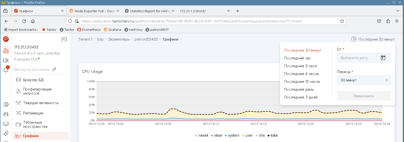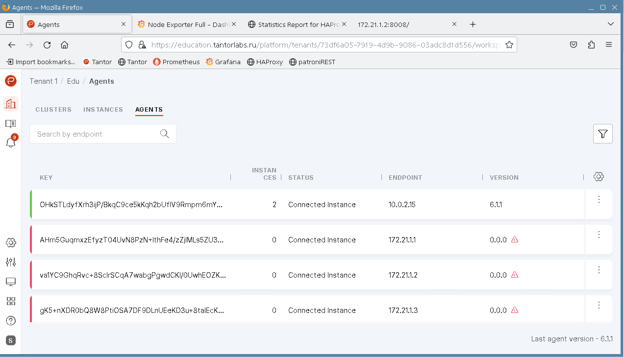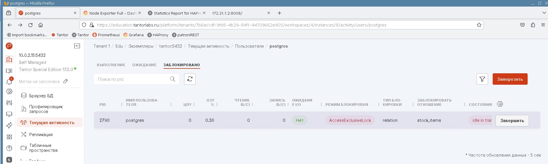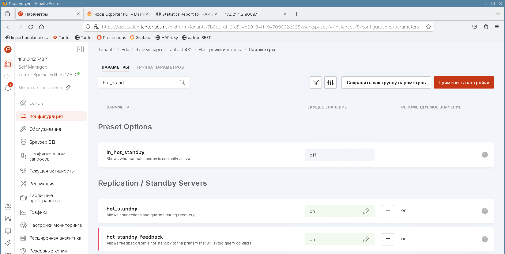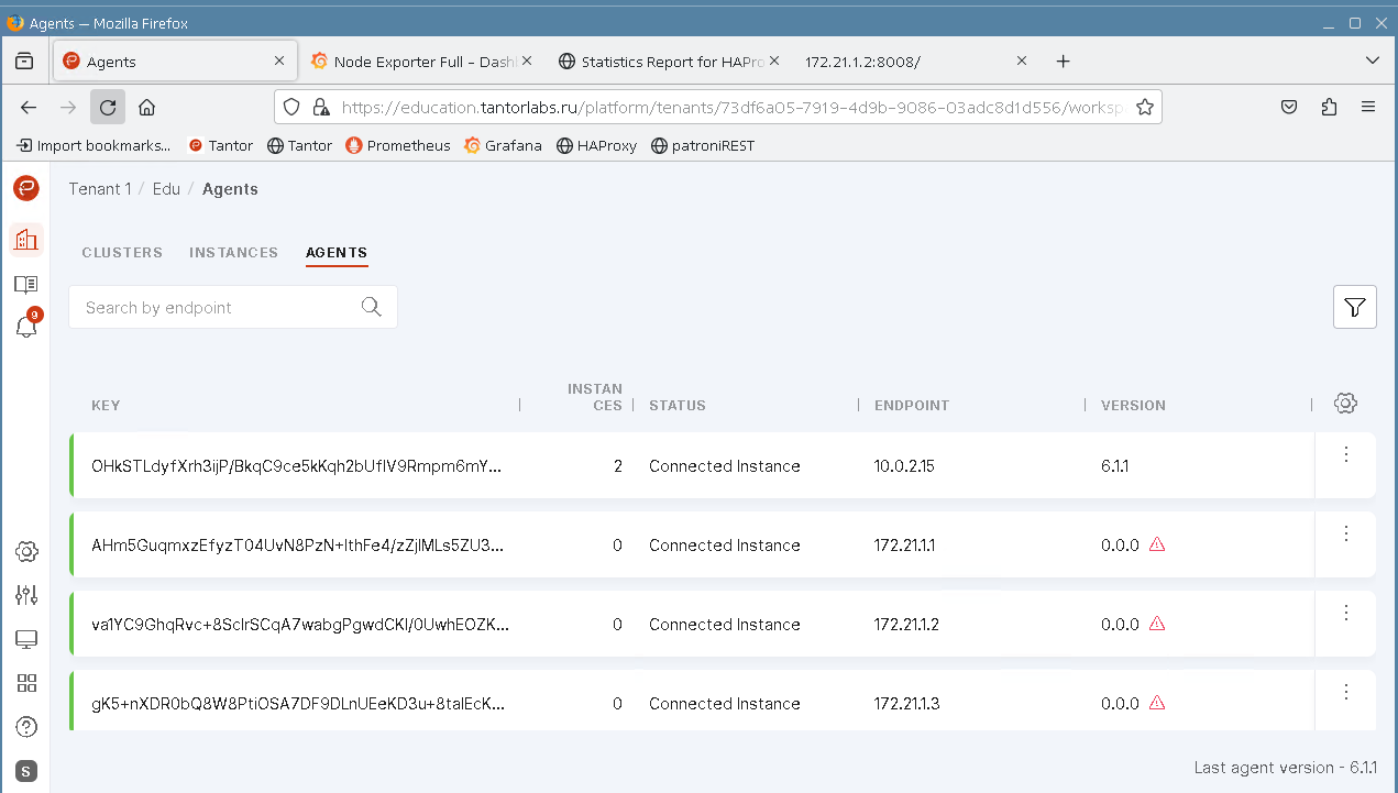 Для проверки того, что рабочие процессы подсоединяются, можно открыть страницу в браузере: https://education.tantorlabs.ru/pg-monitor/hosts