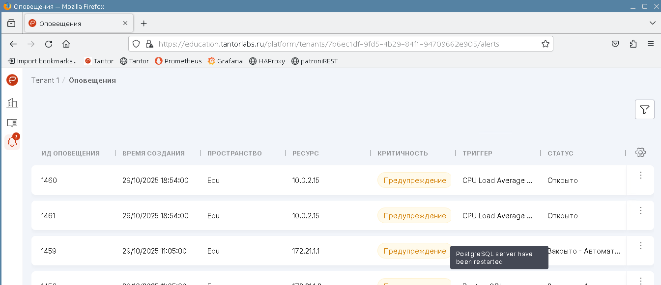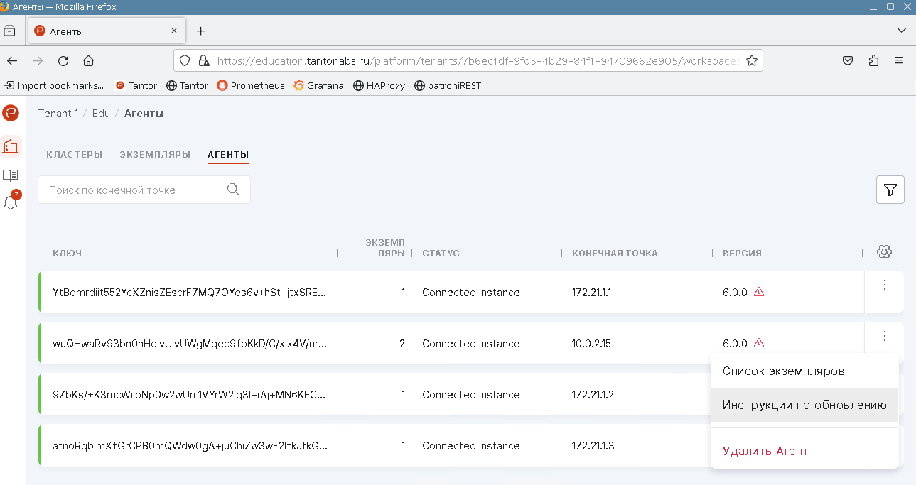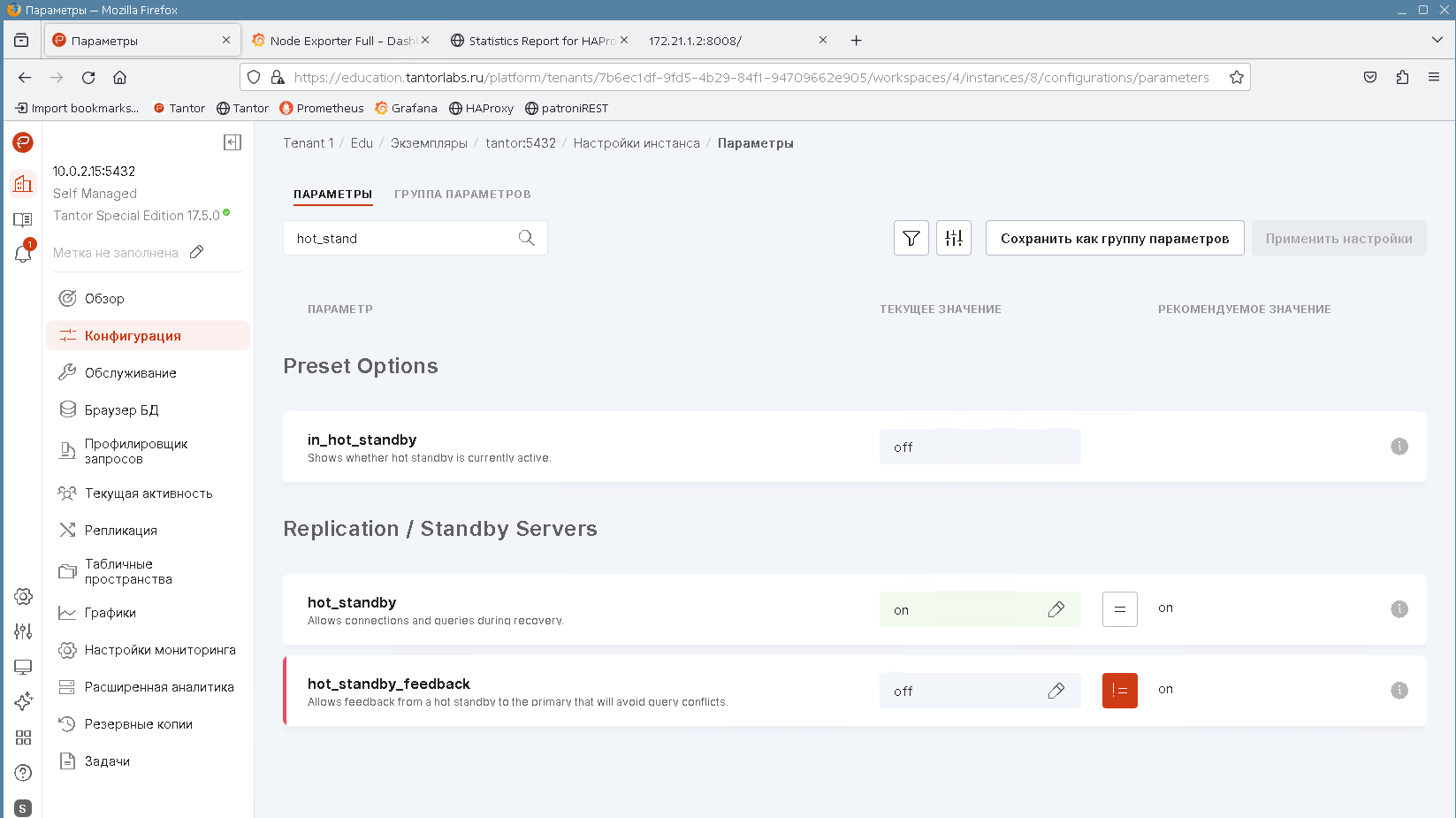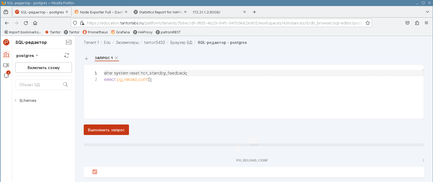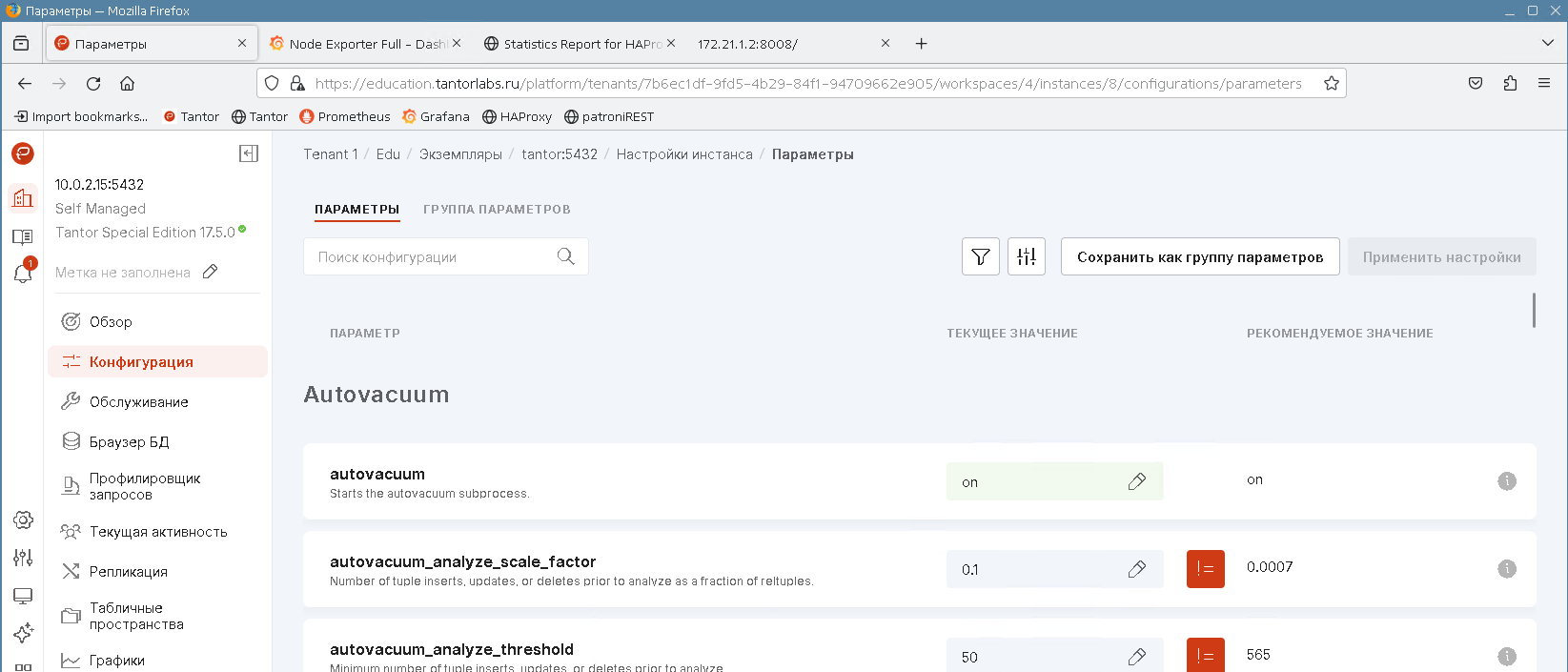 Для проверки того, что рабочие процессы подсоединяются, можно открыть страницу в браузере: https://education.tantorlabs.ru/pg-monitor/hosts