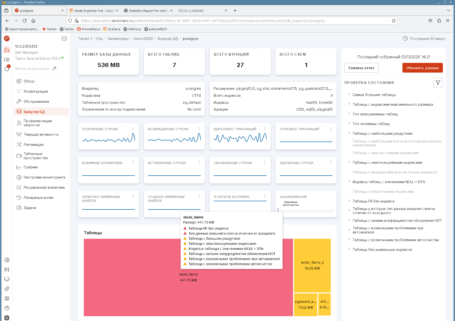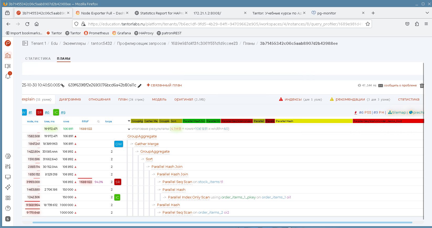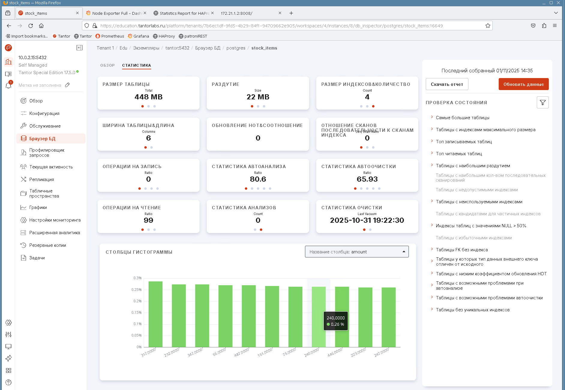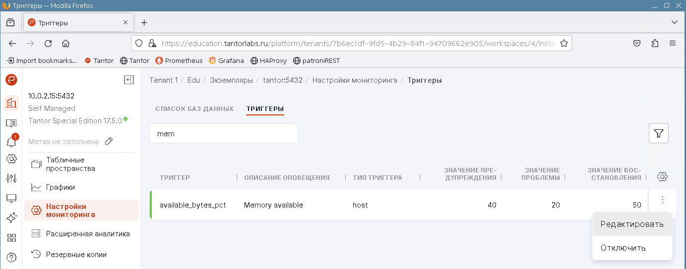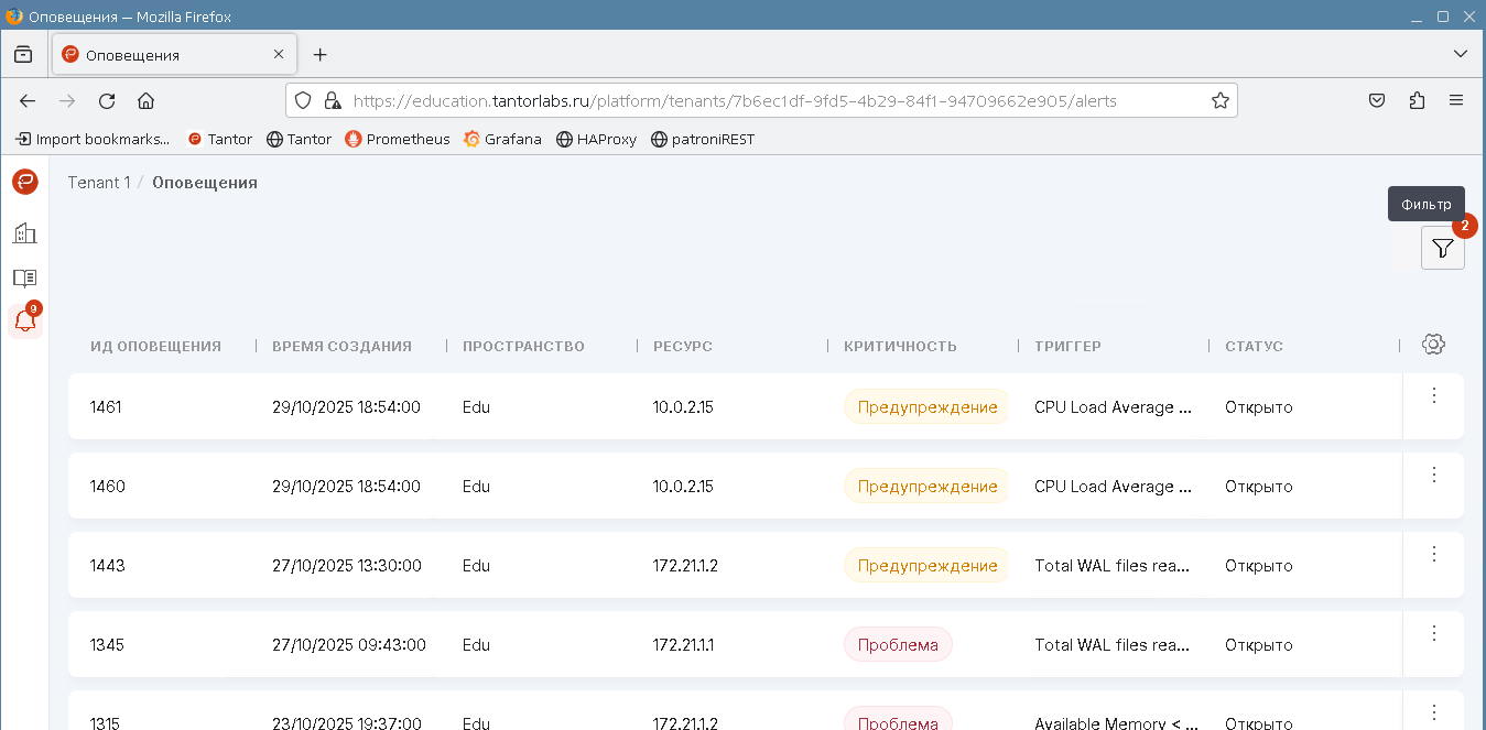 Для проверки того, что рабочие процессы подсоединяются, можно открыть страницу в браузере: https://education.tantorlabs.ru/pg-monitor/hosts