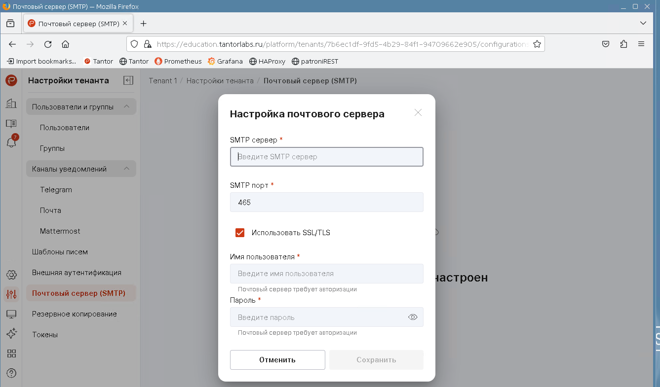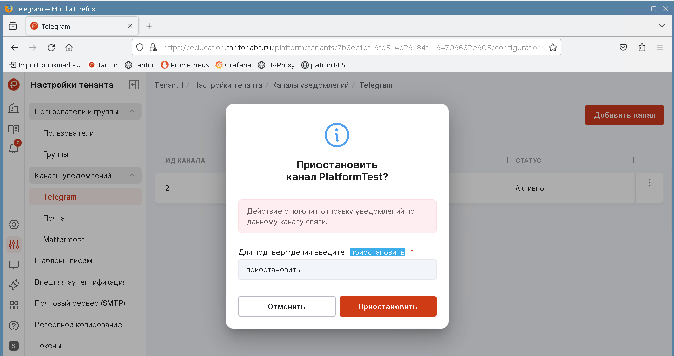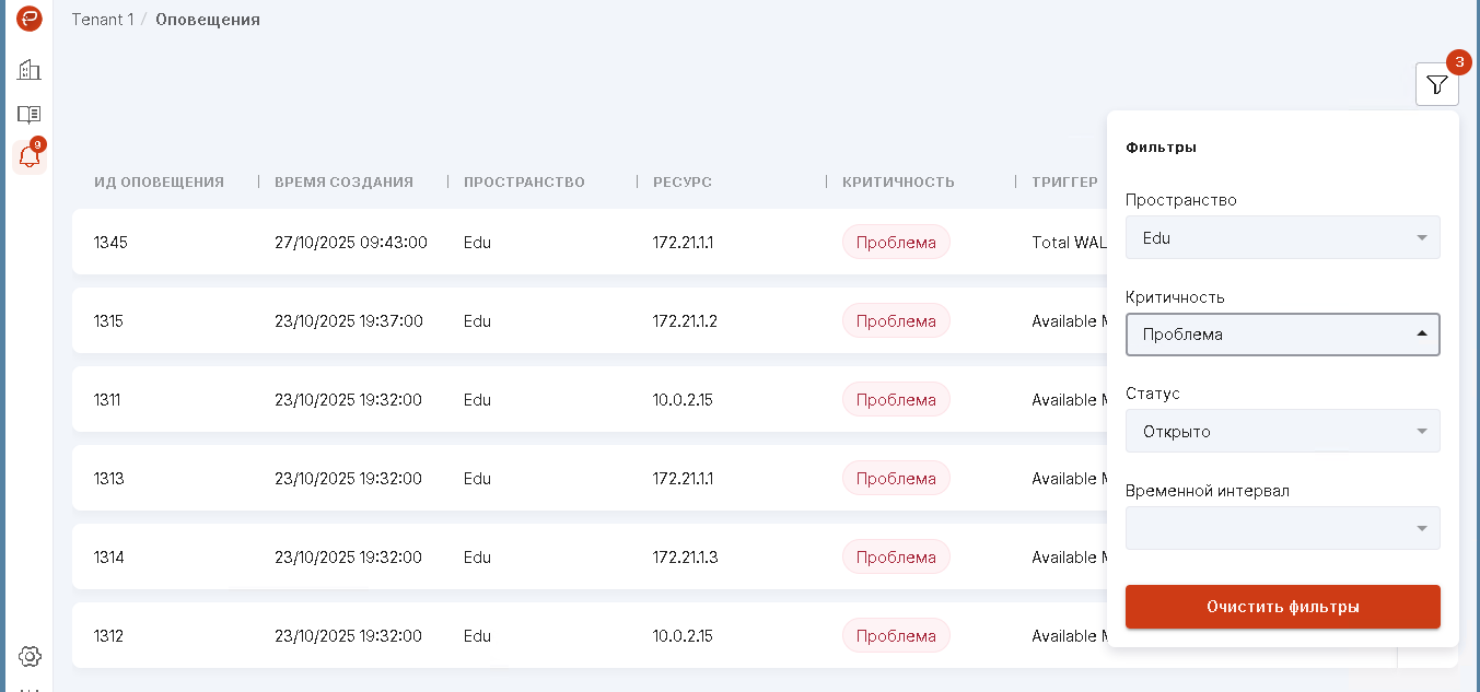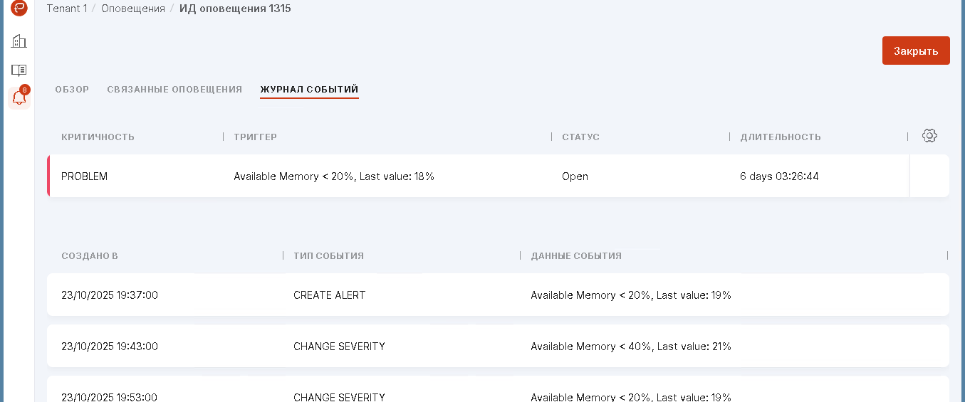 Тенант, Журнал событий, Оповещения, Настройки тенанта.