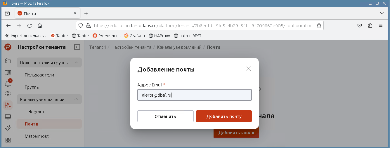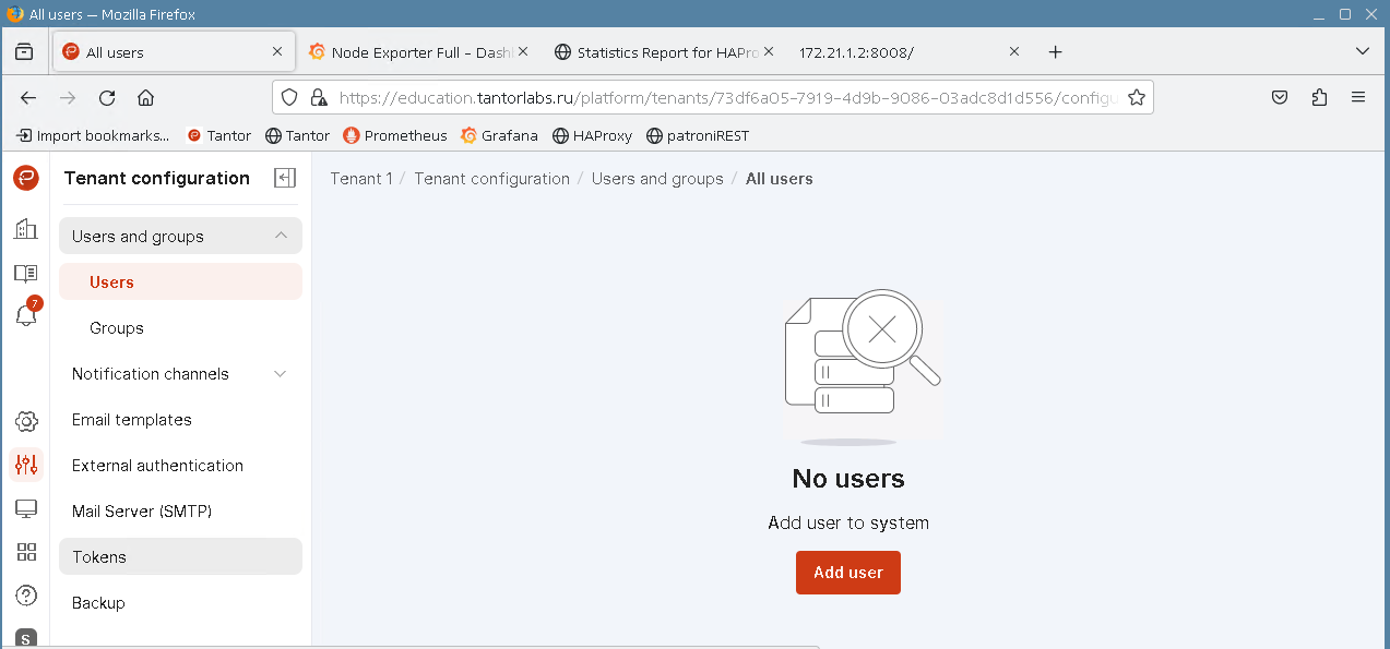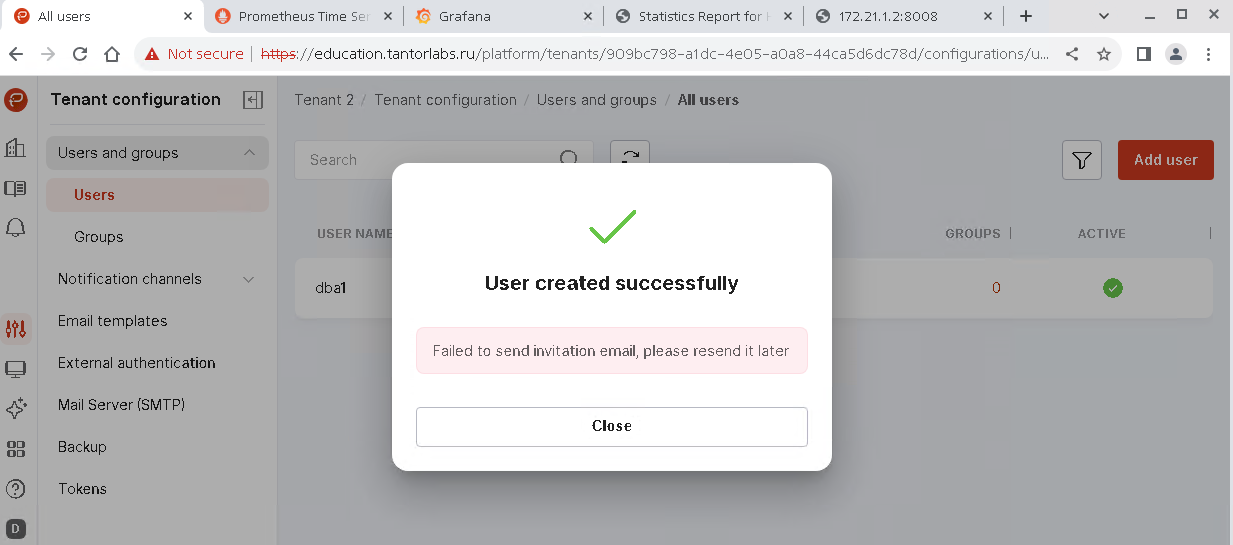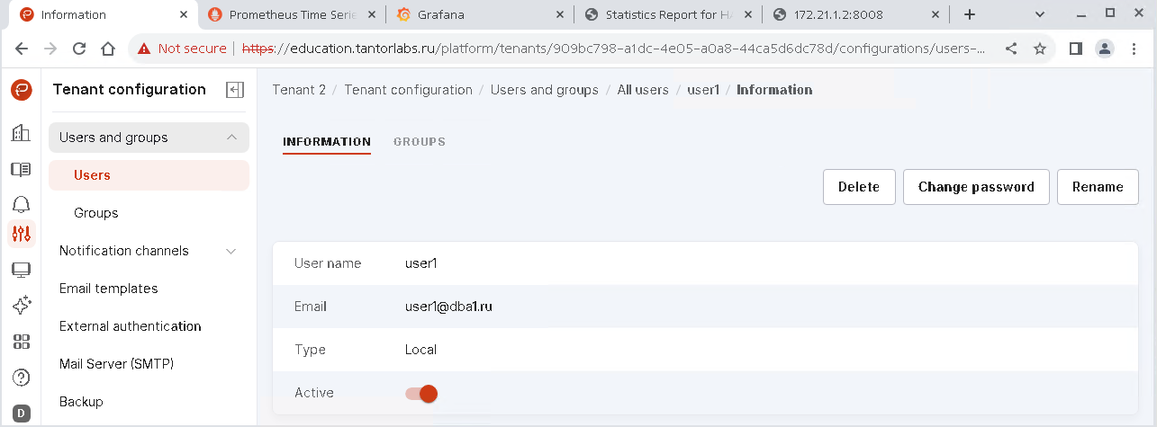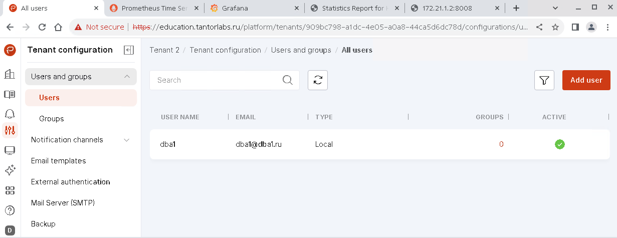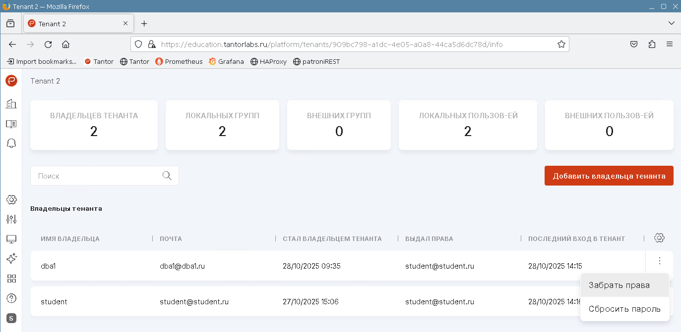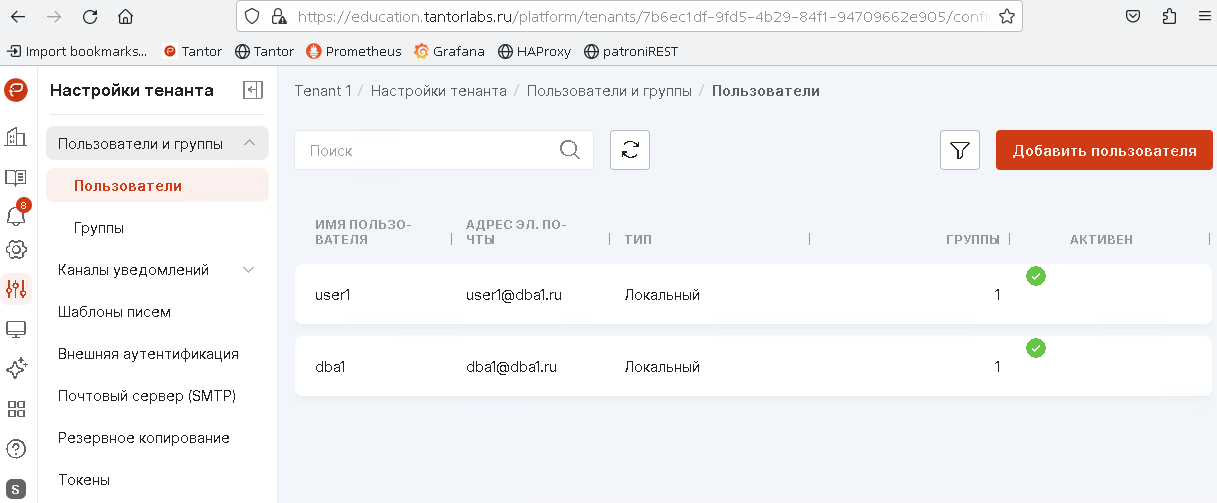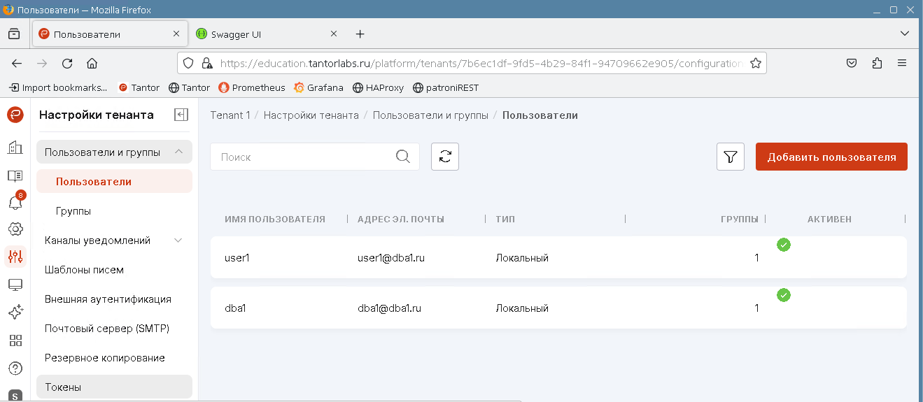 Нажмите на значок Настройки тенанта на левой полосе меню. Откроется меню Настройки тенанта. В меню Пользователи найдите двух пользователей dba1@dba1.ru и user1@dba1.ru