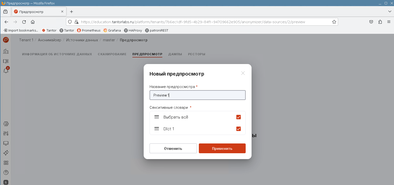 8) Перейдите в Tenant 1. Для этого нажмите в левом верхнему углу на красный кружок с логотипом Тантор и откроется список тенантов.