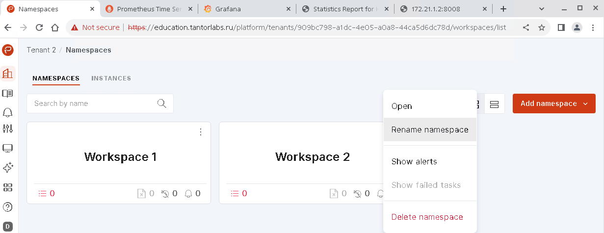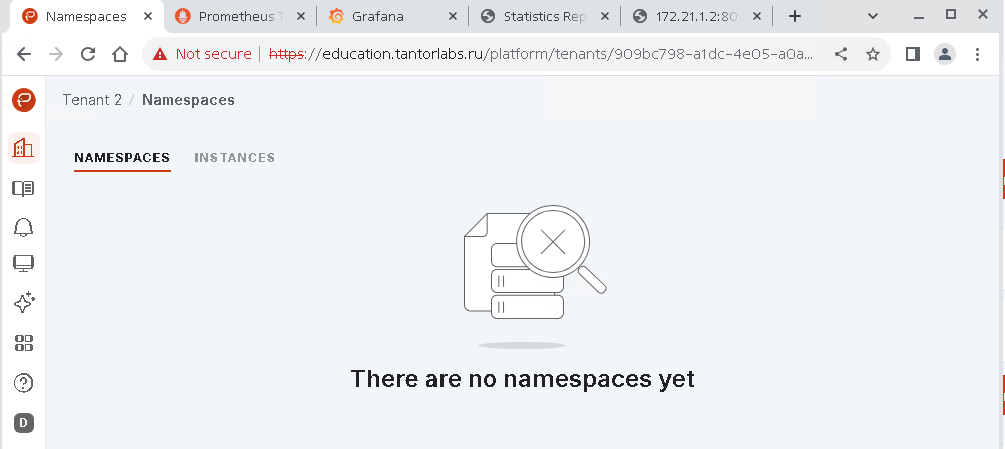 8) Кликните на Tenant 1. Откроется страница с пространствами. Пространств нет. Кликните на кнопку Add namespace и выберите в появившемся меню тип пространства: Platform type.