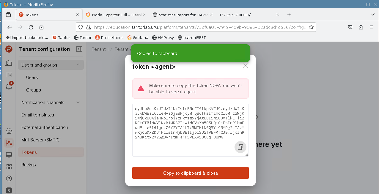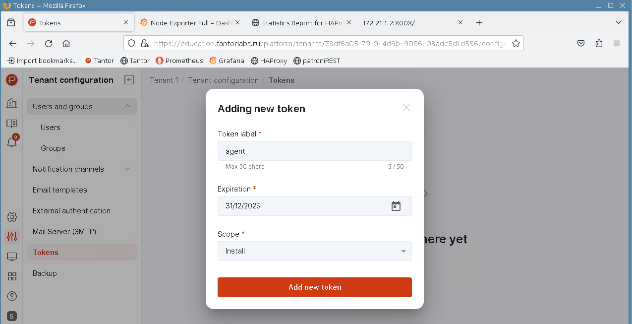 В конце меню будет строка Tokens, кликните на эту строку. На открывшейся странице кликните на красную кнопку Add new token. В появившемся окне выберите Scope = Install, Token label = agent, Expiration = завтрашнюю дату. Кнопка Add new token станет активной (красного цвета), нажмите на эту кнопку.