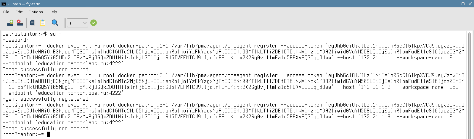 docker exec -it -u root docker-patroni1-1 /var/lib/pma/agent/pmaagent register --access-token 'токен' --host '172.21.1.1' --workspace-name 'Edu' --endpoint 'education.tantorlabs.ru:4222'