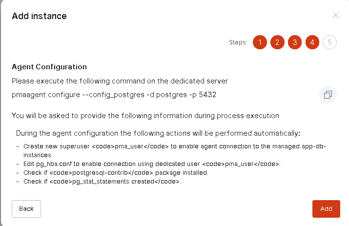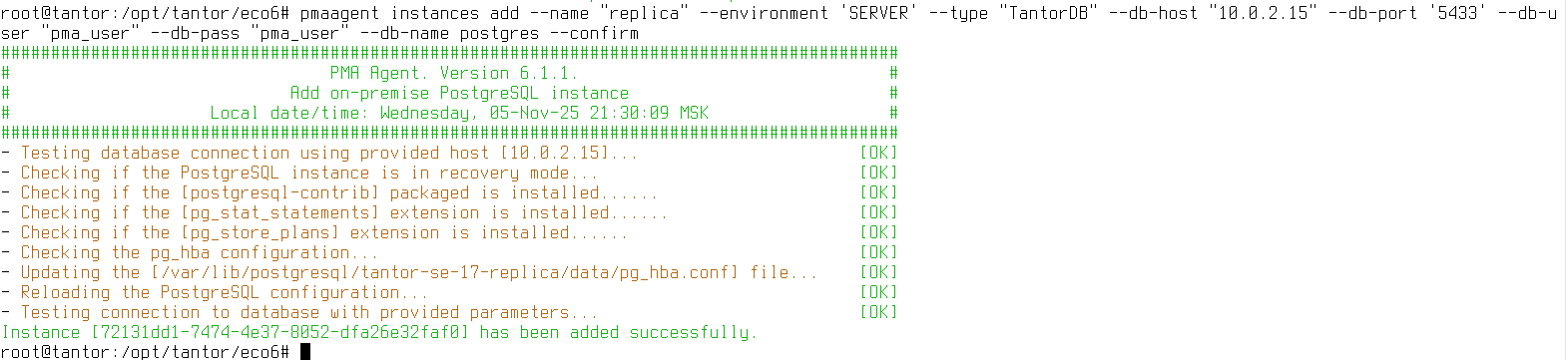 pmaagent instances add --name "replica" --environment 'SERVER' --type "TantorDB" --db-host "10.0.2.15" --db-port '5433' --db-user "pma_user" --db-pass "pma_user" --db-name postgres --confirm