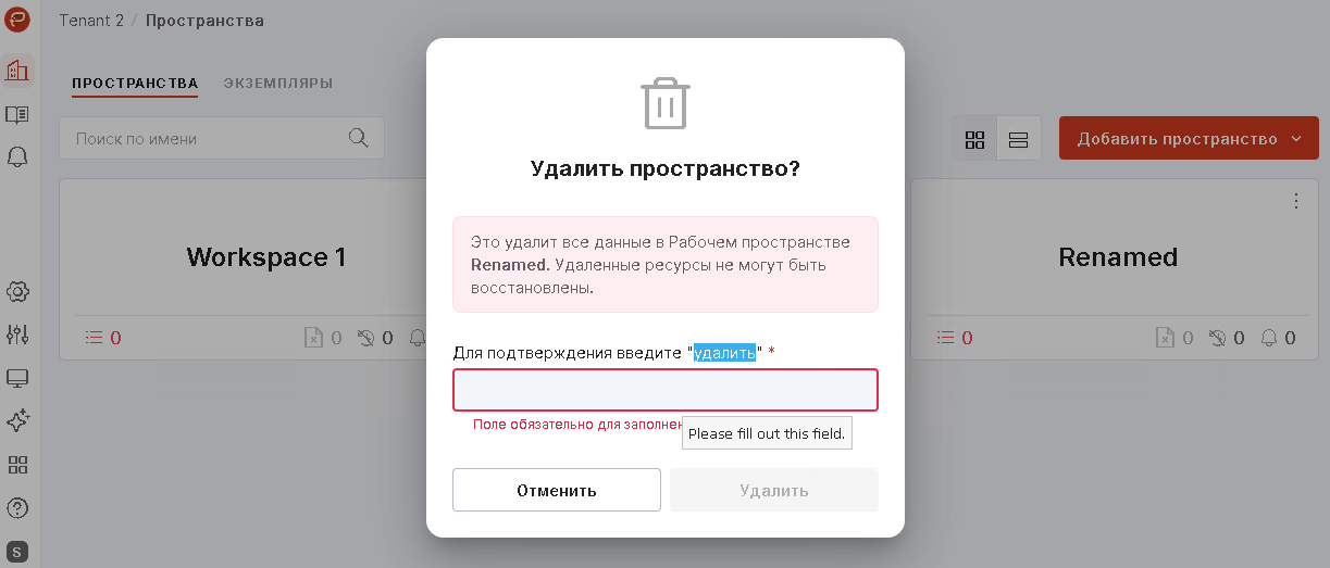4) Переименуйте пространство Workspace 3 в Renamed. Для этого кликните в правом верхнем углу плашки пространства на значок три точки. Появится всплывающее меню, в нём выберите Переименовать пространство. Попробуйте ввести имя существующего пространства (Workspace 2), выдастся ошибка. Введите имя пространства, которого нет (Renamed) и пространство будет переименовано.