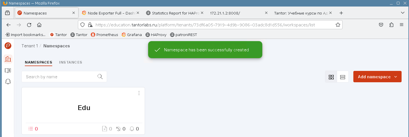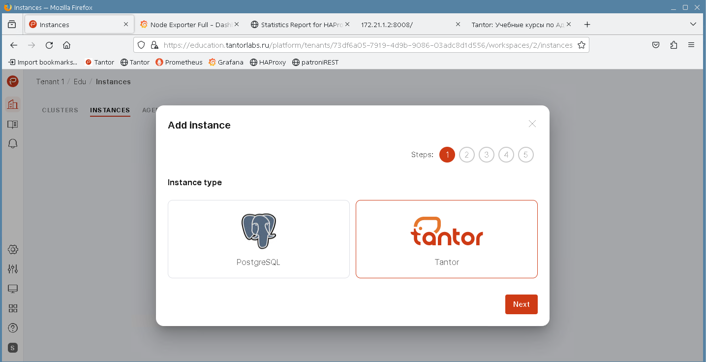 1) Кликните на плашку пространства Edu. Появится страница со списком экземпляров. Список будет пуст. Кликните на кнопку Add Instance. В появившемся окне выберите Tantor и кликните на кнопку Next