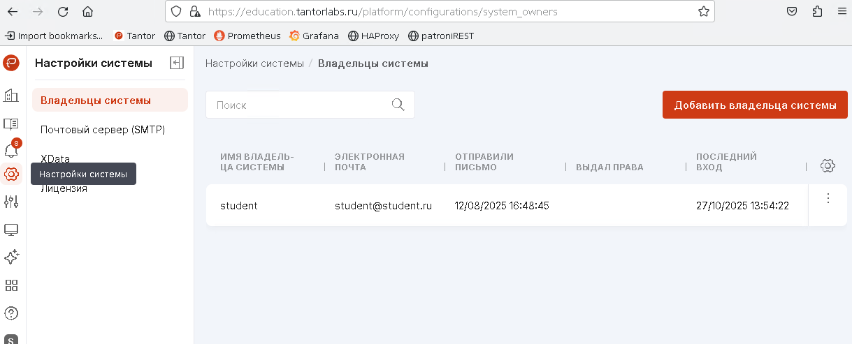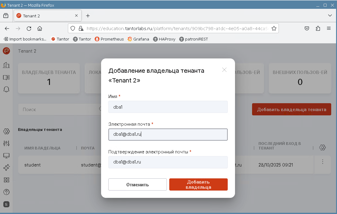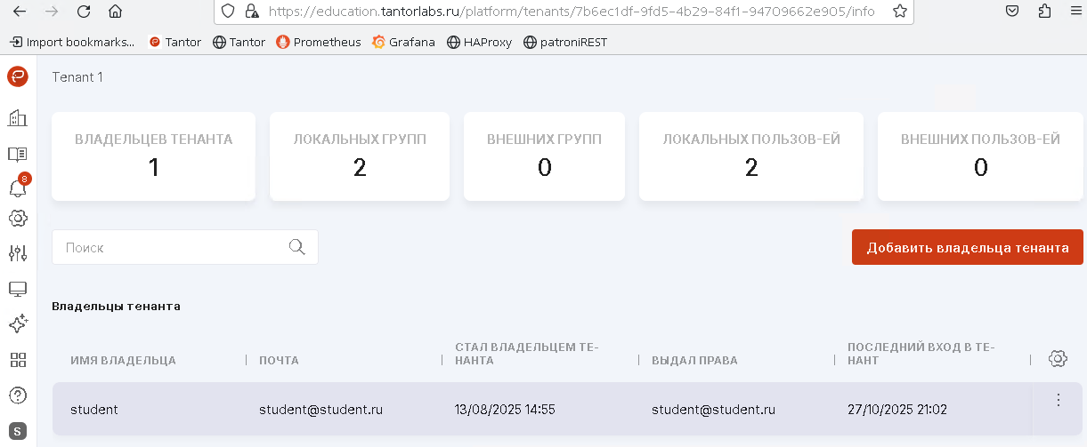 появится страница с описанием тенанта, на которой и будет список владельцев тенанта. Владельцы системы также присутствуют в этом списке: