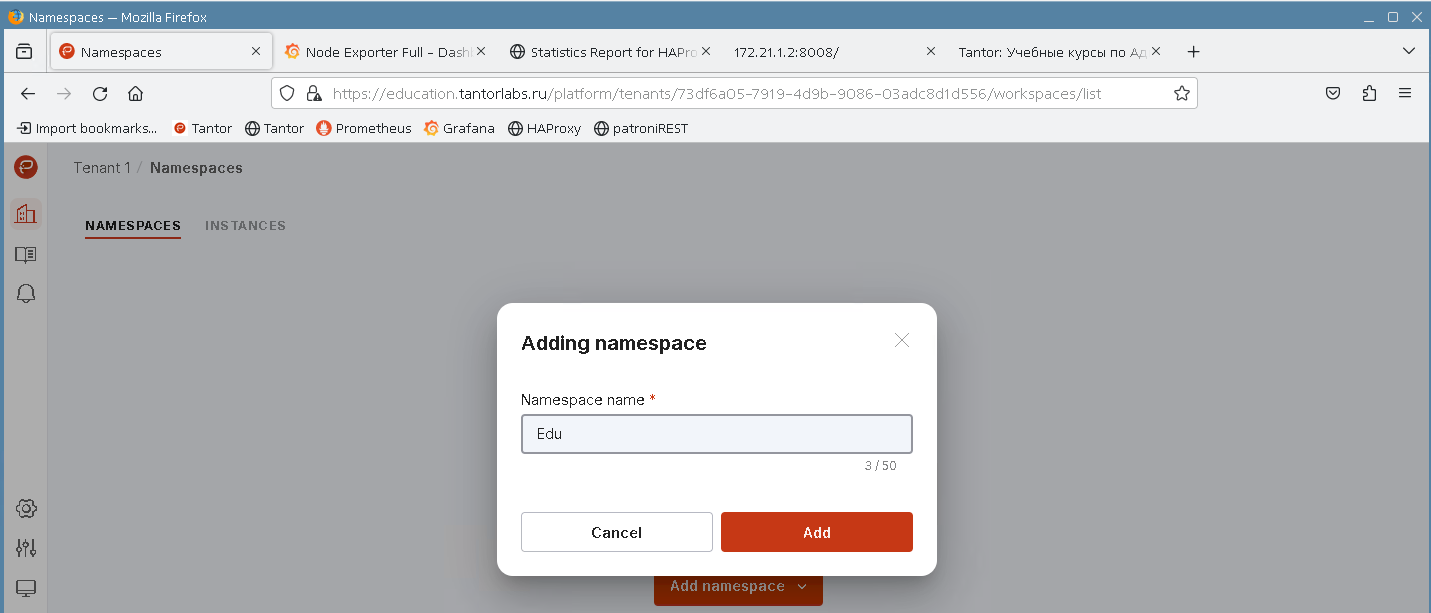 9) В появившемся окне введите название создаваемого пространства: Edu и нажмите кнопку Add.