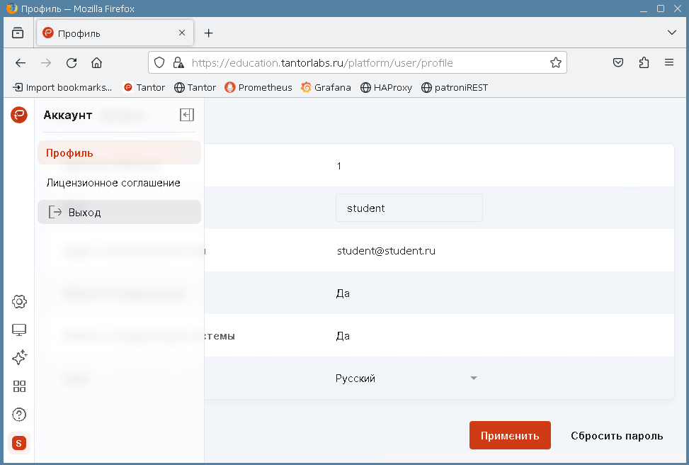В браузере Firefox сессия создана под владельцем системы student@student.ru