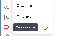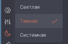 6) В левой полосе меню найдите значок Смена темы, поменяйте тему на Тёмную, Светлую, Системную. Иконки значка при этом будут меняться. Оставьте Системную тему.