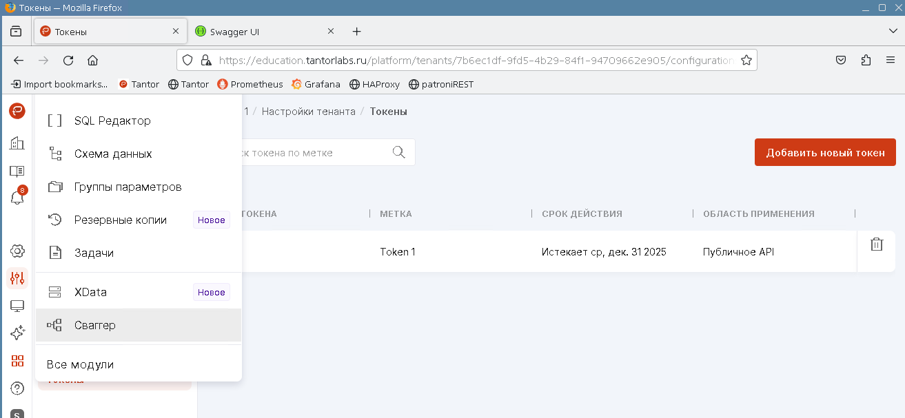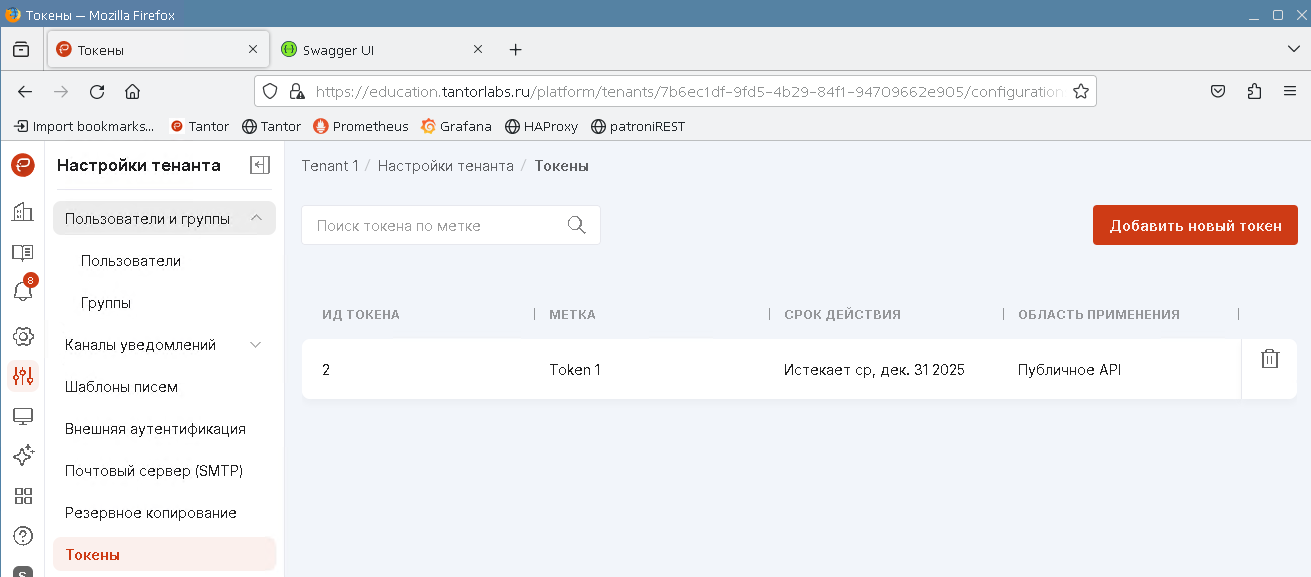 В конце меню будет строка Токены, кликните на эту строку. На открывшейся странице кликните на красную кнопку Добавить новый токен. В появившемся окне выберите Область применения = Публичное API, Метка = Token 1, Срок действия = завтрашнюю дату. Кнопка Добавить новый токен станет активной (красного цвета), нажмите на эту кнопку.