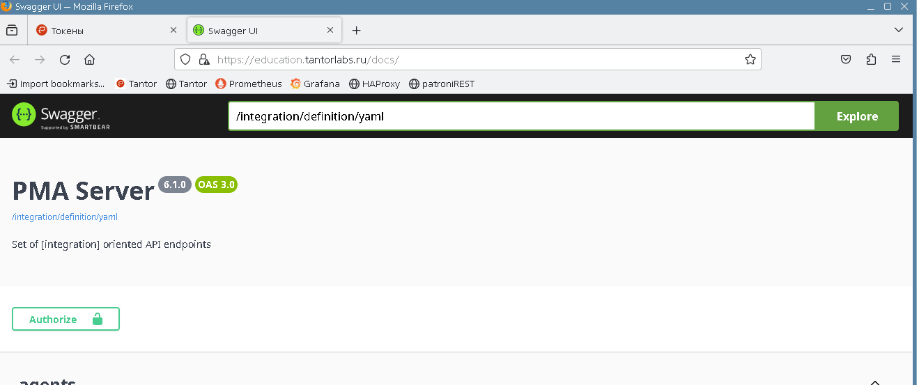 Кликните в окне Сваггера на зелёную кнопку Authorize.