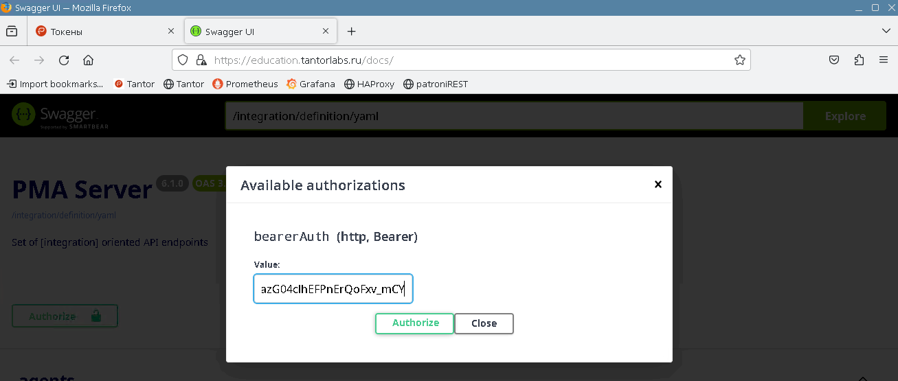 5) Вставьте скопированное значение токена, нажмите зелёную кнопку Authorize.