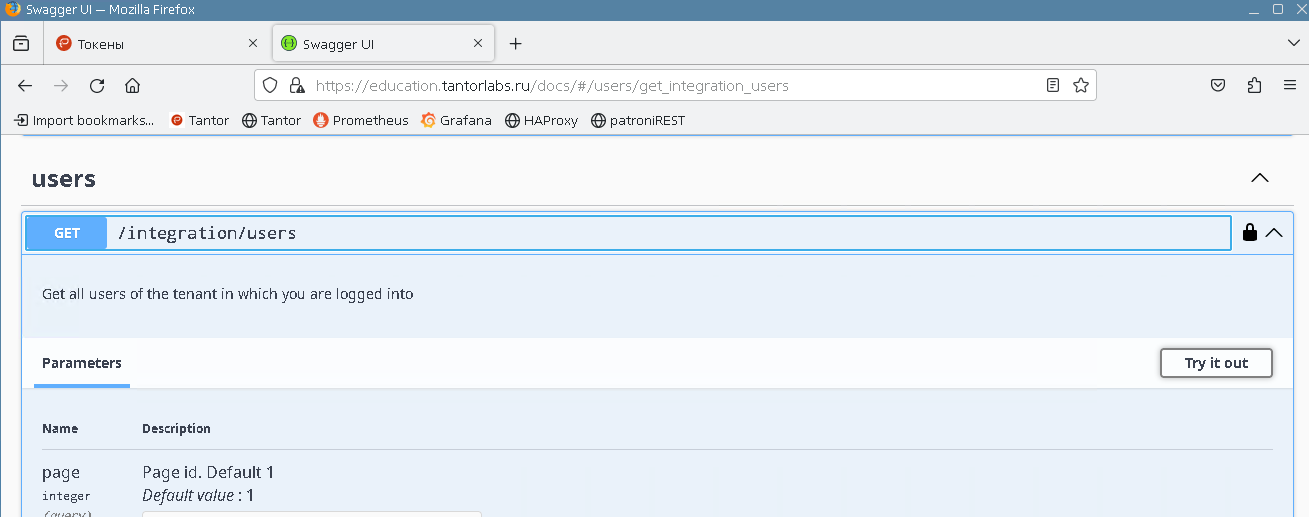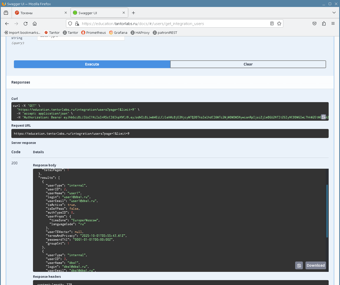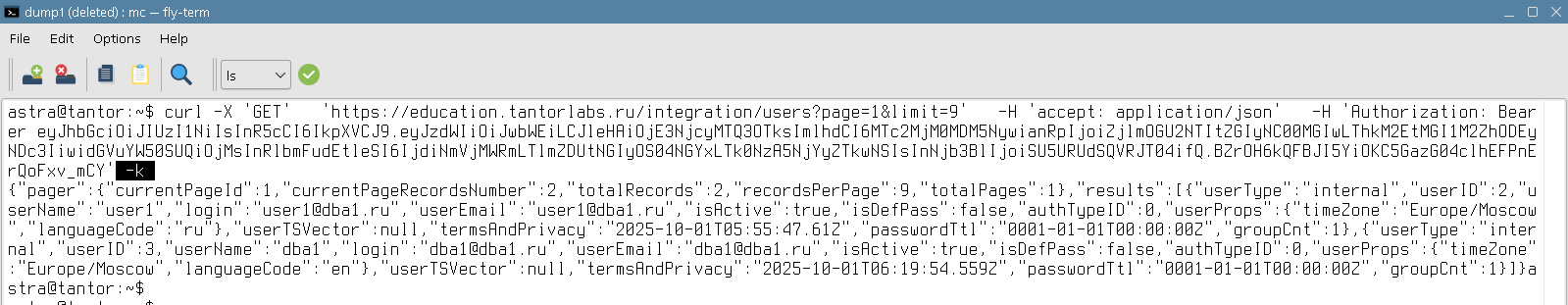 curl -X 'GET' 'https://education.tantorlabs.ru/integration/users?page=1&limit=9' -H 'accept: application/json' -H 'Authorization: Bearer ey...xv_mCY' -k