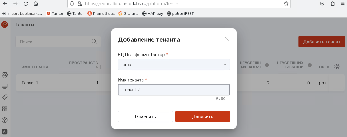 1) Для перехода на стартовую страницу Платформы кликните на логотип Тантор в левом верхнем углу страницы браузера. Откроется страница Тенанты. На странице нажмите красную кнопку Добавить тенант. Создайте новый тенант с названием Tenant 2: