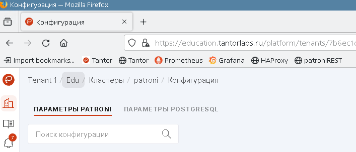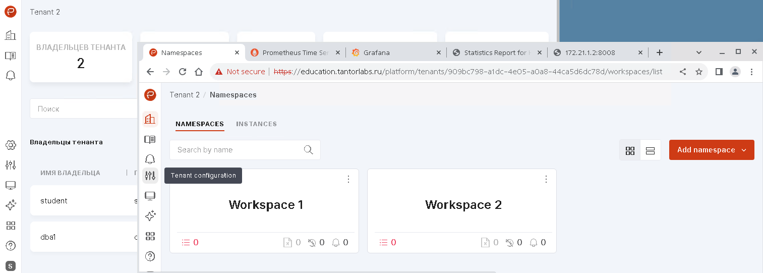 1) Кликните в окне браузера слева вверху на круглый оранжевый значок с логотипом Тантор. Откроется страница со списком тенантов. Кликните на строку Tenant 1. Откроется страница со списком пространств. Вы находитесь в тенантеTenant 1 и на левой вертикальной полосе меню появится значок Tenant configuration (на картинке ниже шестой по счёту, подсвечен красноватым фоном). Кликните на это значок и появится меню Tenant configuration.