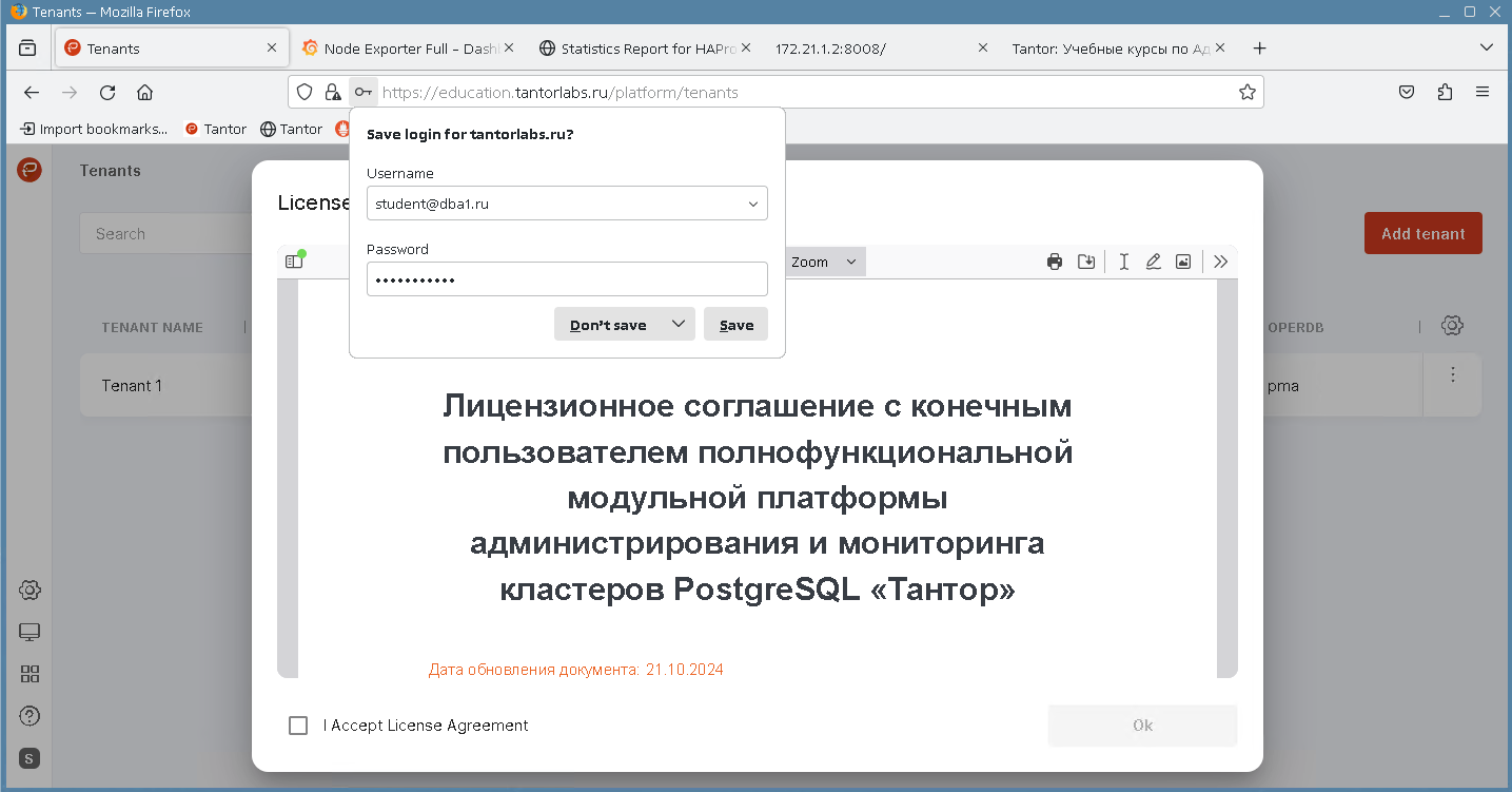 В появившемся окне браузера Save login for tantorlabs.ru кликните на кнопку Save. В окне с лицензионным соглашением можно выбрать галочку I Accept License Agreement и нажать кнопку OK.