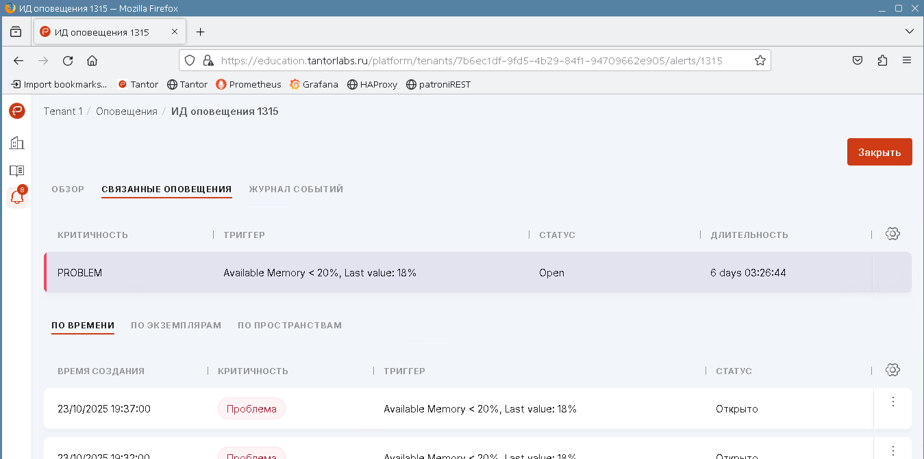 13) Откройте список экземпляров Tenant 1. Для этого перейдите на страницу тенанта Tenant 1 и кликните на вкладке ЭКЗЕМПЛЯРЫ: